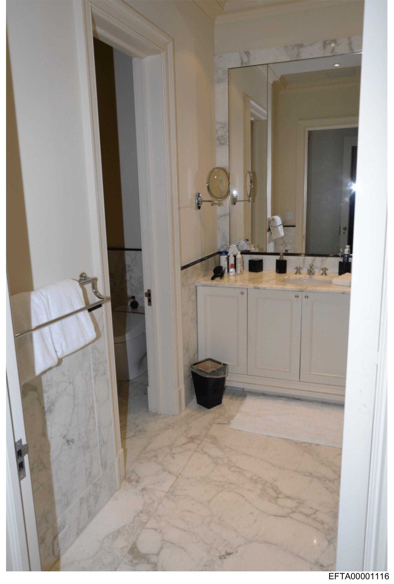 The image displays a neatly arranged bathroom interior. The bathroom features marble flooring and matching countertops that hold two sinks. Above the sinks is a large mirror framed by what appears to be marble as well. To the left, there's an open doorway revealing another room, and on the right side of the frame, a partial view of a white towel hanging on a rack can be seen. The overall lighting suggests it might be daytime, and no text or people are present in the image.
