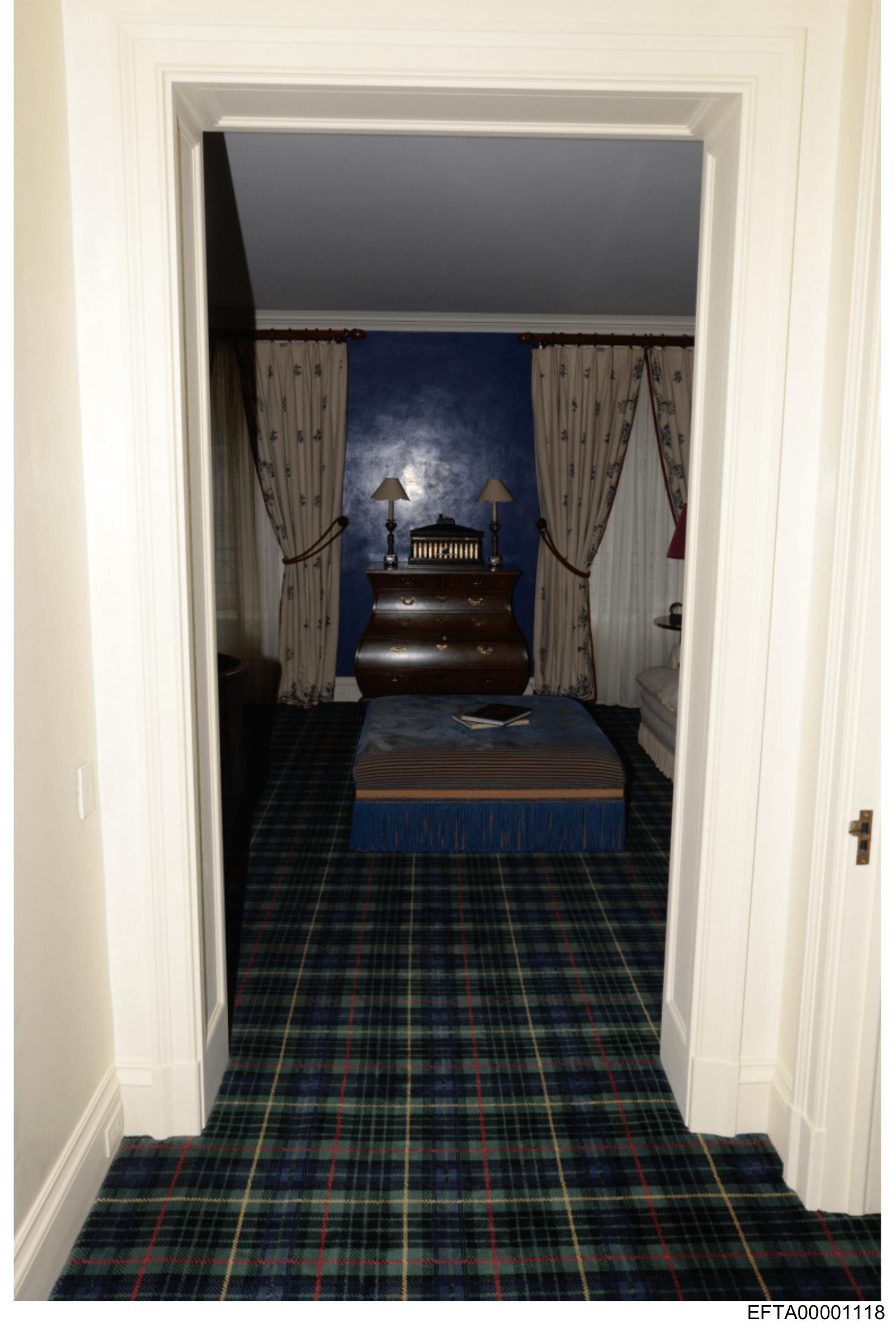 The image shows an interior scene with a doorway leading to another room. The door is open, revealing a glimpse of the interior which includes a patterned carpet and what appears to be a bed with white bedding in the background. There are curtains on either side of the window, suggesting a residential setting. A portion of a wall hanging or artwork can also be seen, featuring an image that resembles a person's face. No text is visible in the image, and there are no people present in the frame.