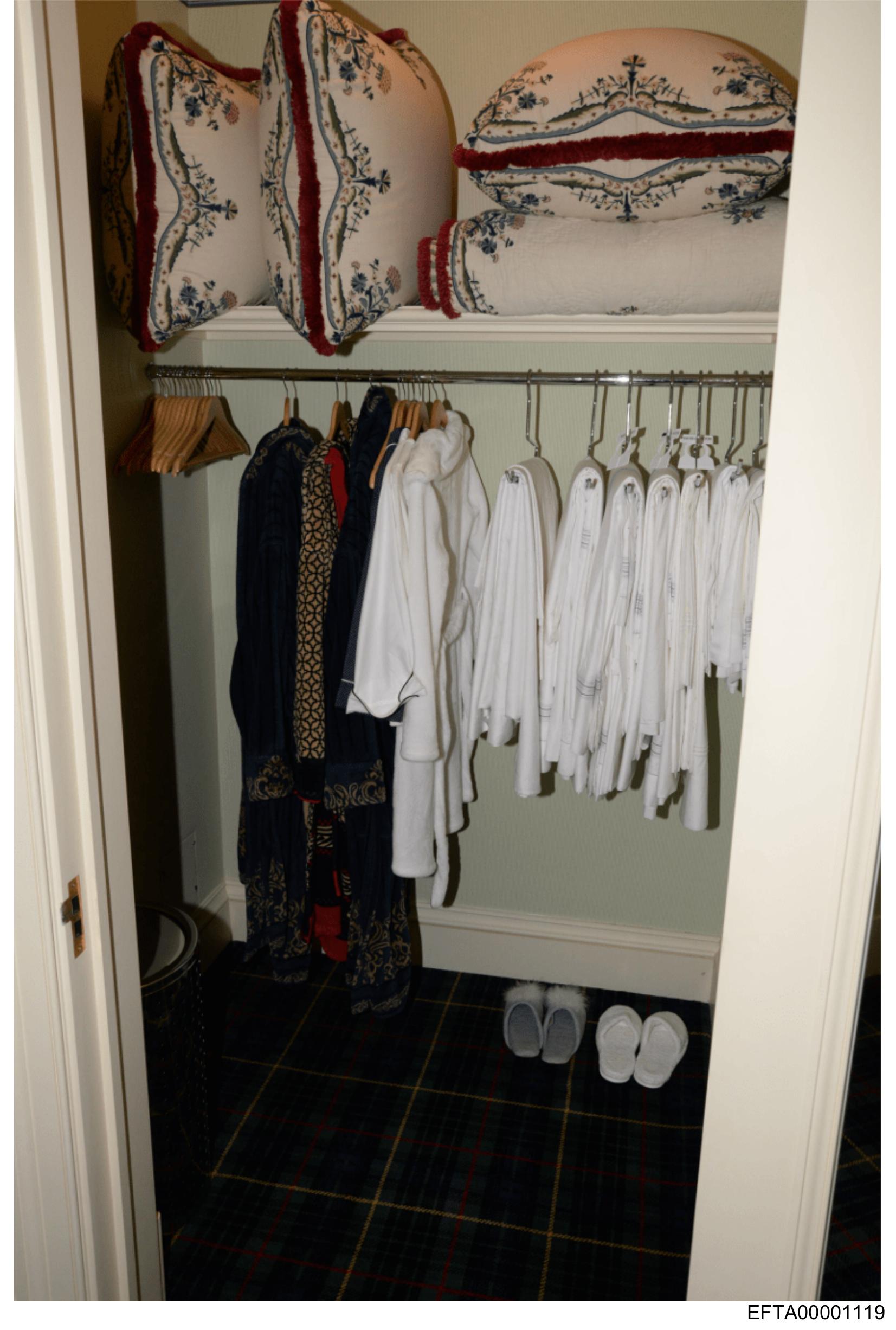 The image shows an interior space that appears to be a closet filled with clothing.