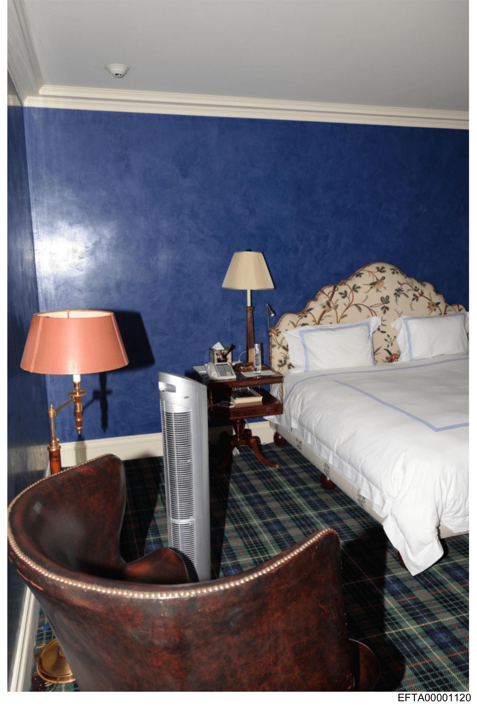 The image shows a neatly arranged hotel room with blue walls and patterned wallpaper at the top.