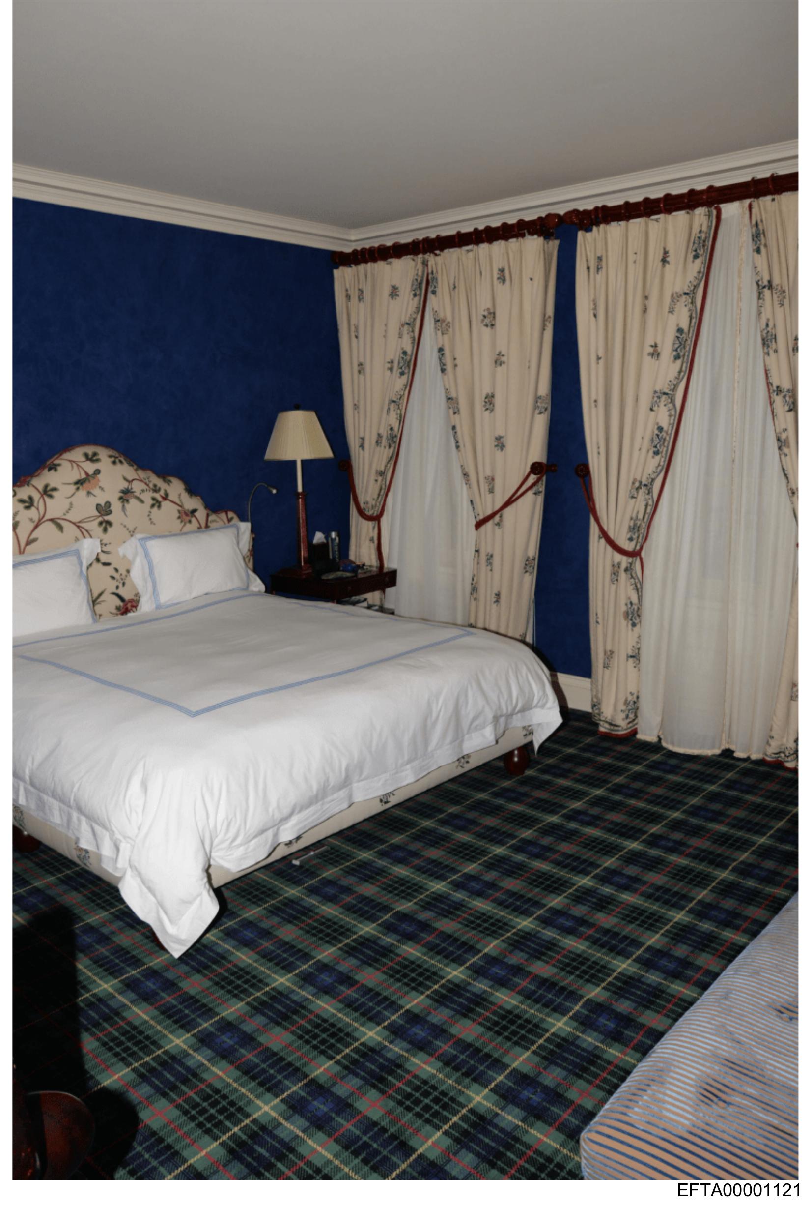 The image shows an interior view of a room that appears to be part of a hotel suite. The main focus is on a bed dressed with white bedding and adorned with decorative pillows. Above the bed, there's artwork or wallpaper with a floral pattern. To the right of the bed stands a wooden nightstand holding a lamp. A blue wall forms the backdrop for these furnishings, and it's accentuated by large windows draped with sheer curtains that have red trim at the top. The window treatments allow natural light to fill the room, which features a patterned carpet on the floor.