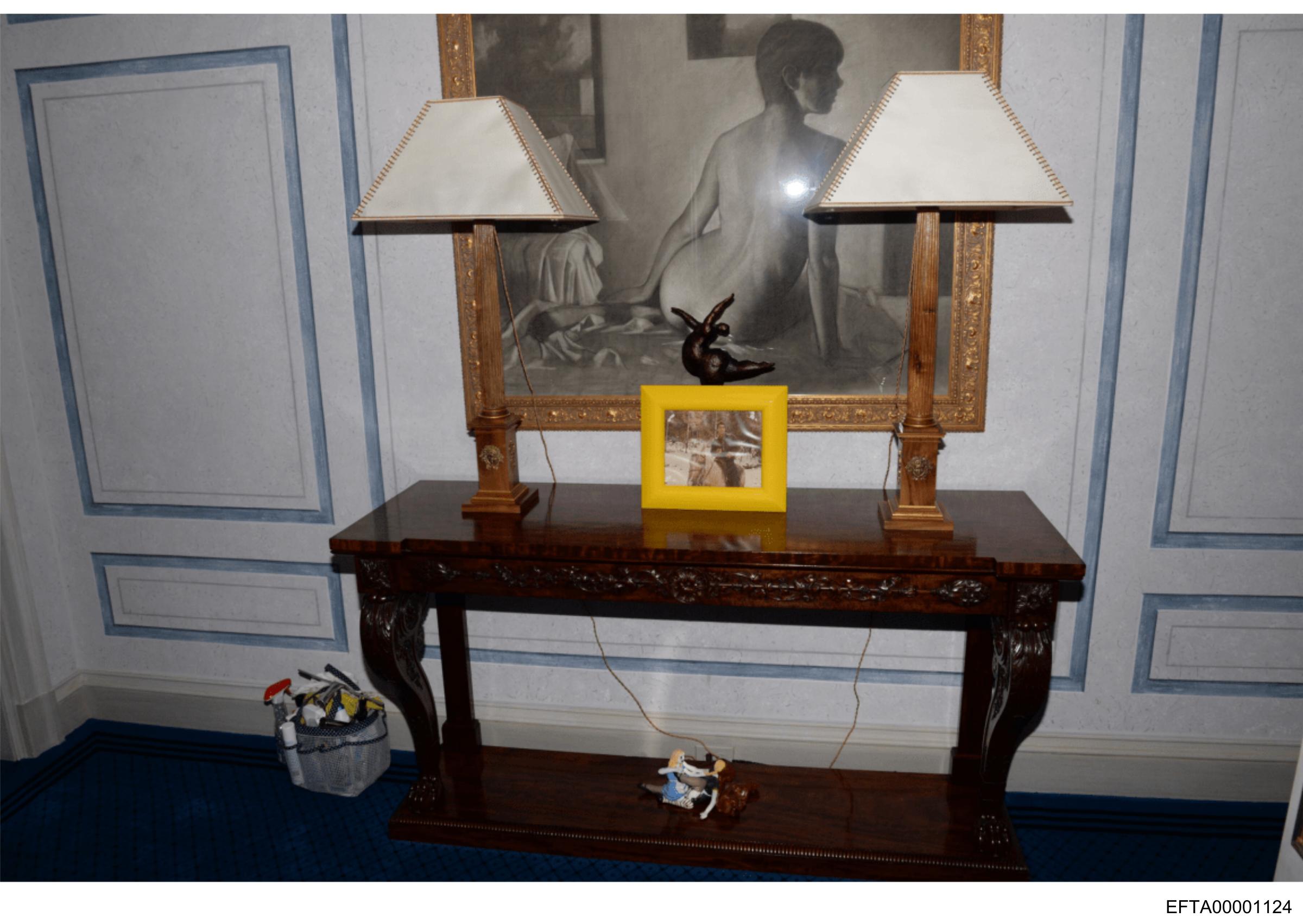 The image depicts an interior scene featuring a wooden side table with various items on top. Prominently displayed is a photograph in a yellow frame that seems to feature a person who is partially obscured by what appears to be a reflection of a light source. To the right, there's another framed picture hanging on the wall above the table, showing a similar figure but this time fully visible. The photo on the table has a handwritten note next to it with text that reads "ET" and is signed at the bottom with "1982," which could indicate the significance of the year 1982 to the context or the owner's experience. The side table also holds what looks like a small figurine or toy on the left and various other items including books or binders stacked underneath it. The room has blue walls with lighter blue trim, and there is additional decorative lighting above that reflects off of the photograph. The overall style of the image suggests it may have been taken by someone who wanted to capture these objects in their home environment.