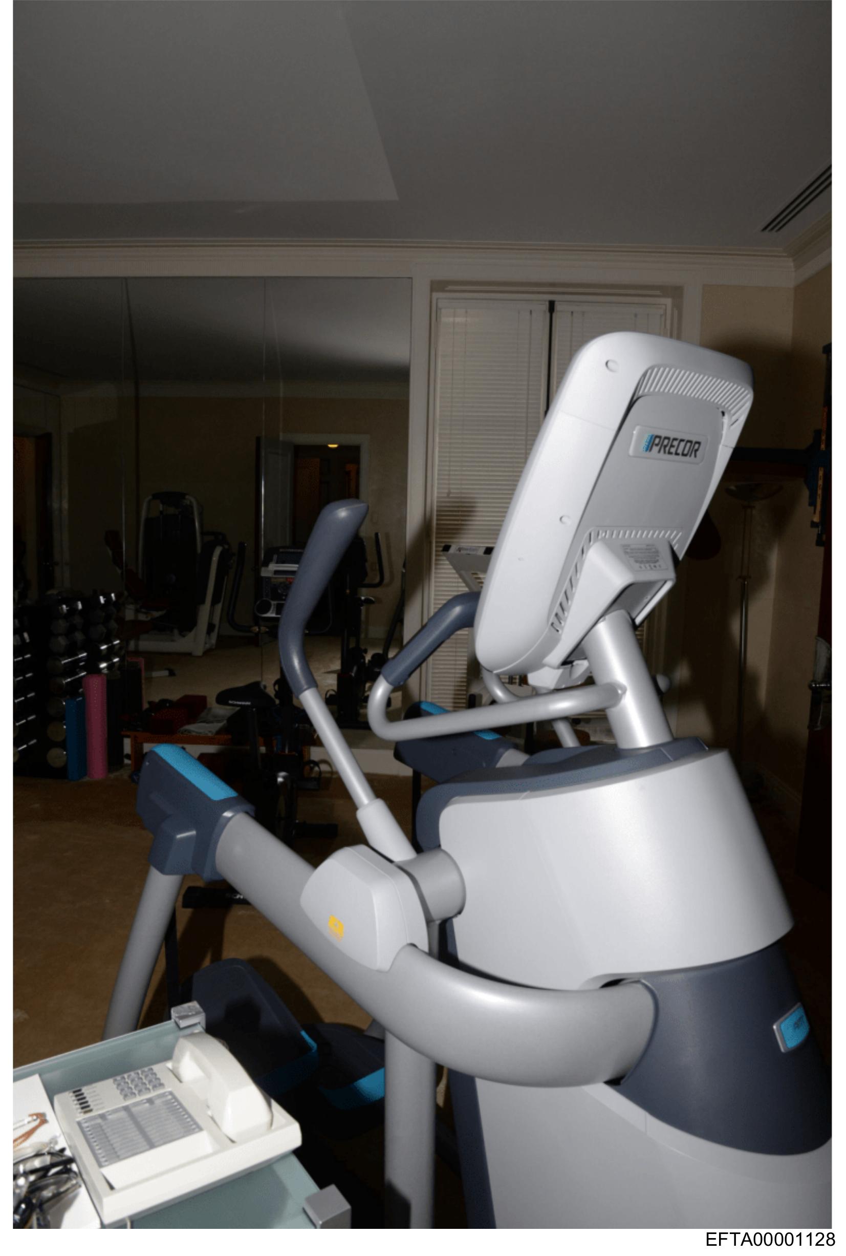 The image shows an indoor setting with a focus on a piece of exercise equipment, specifically a stationary bike.
