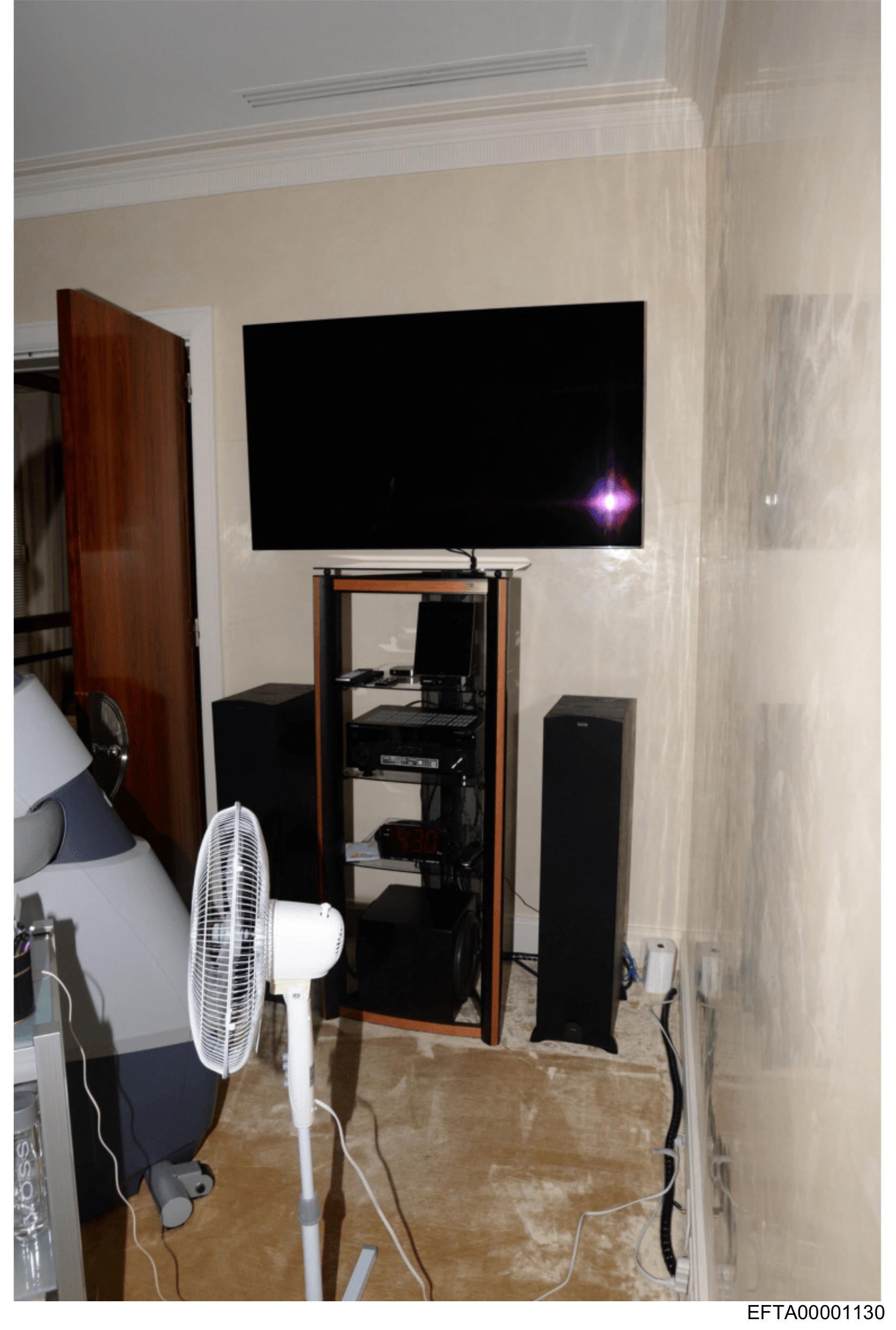 The image depicts a room with an entertainment setup on the left wall.