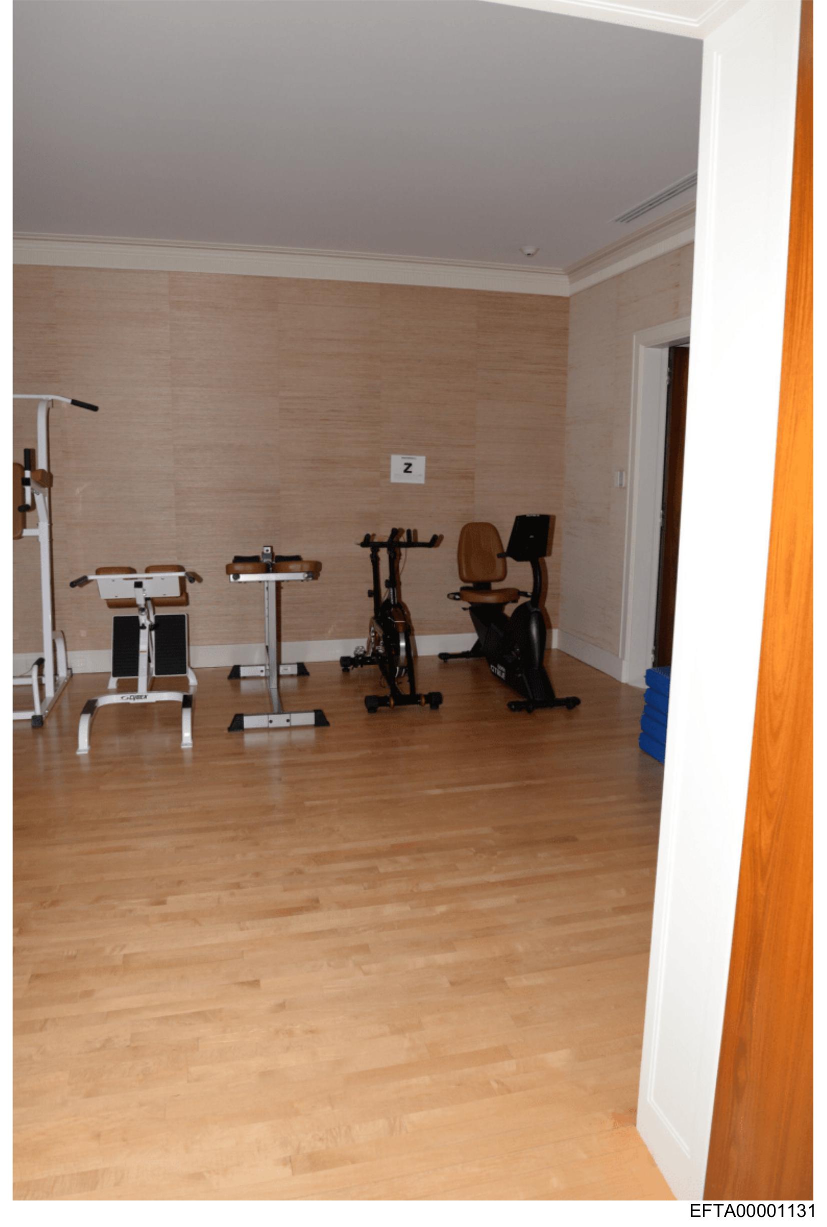 The image shows an indoor gym with various pieces of exercise equipment. There's a treadmilling machine on the left side and another piece of equipment that appears to be a stationary bike. The flooring is wooden, and there are white walls with ceiling tiles above. A door with a glass panel is open, allowing a glimpse into the room. The lighting suggests an indoor setting, and there are no visible texts or people in the image.