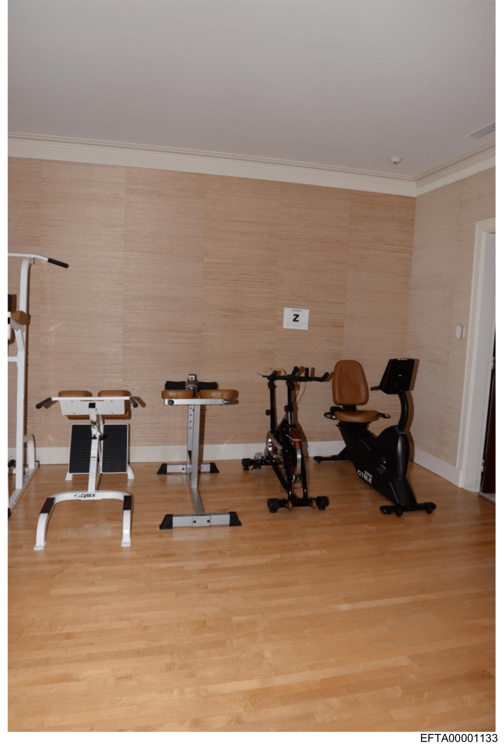 The image shows an interior space that appears to be a home gym or fitness room. The room has wood paneling on the walls and a wooden floor. On the left side of the frame, there is a row of exercise equipment including what looks like a treadmill, elliptical machine, and possibly a stationary bike. To the right, there's a mirror above two padded benches that may be used for weightlifting or other exercises requiring balance. The room is well-lit with overhead lights, and there are no people visible in the photo. In the upper left corner of the image, there is a watermark text "cull" which might indicate the source or ownership of the photo.