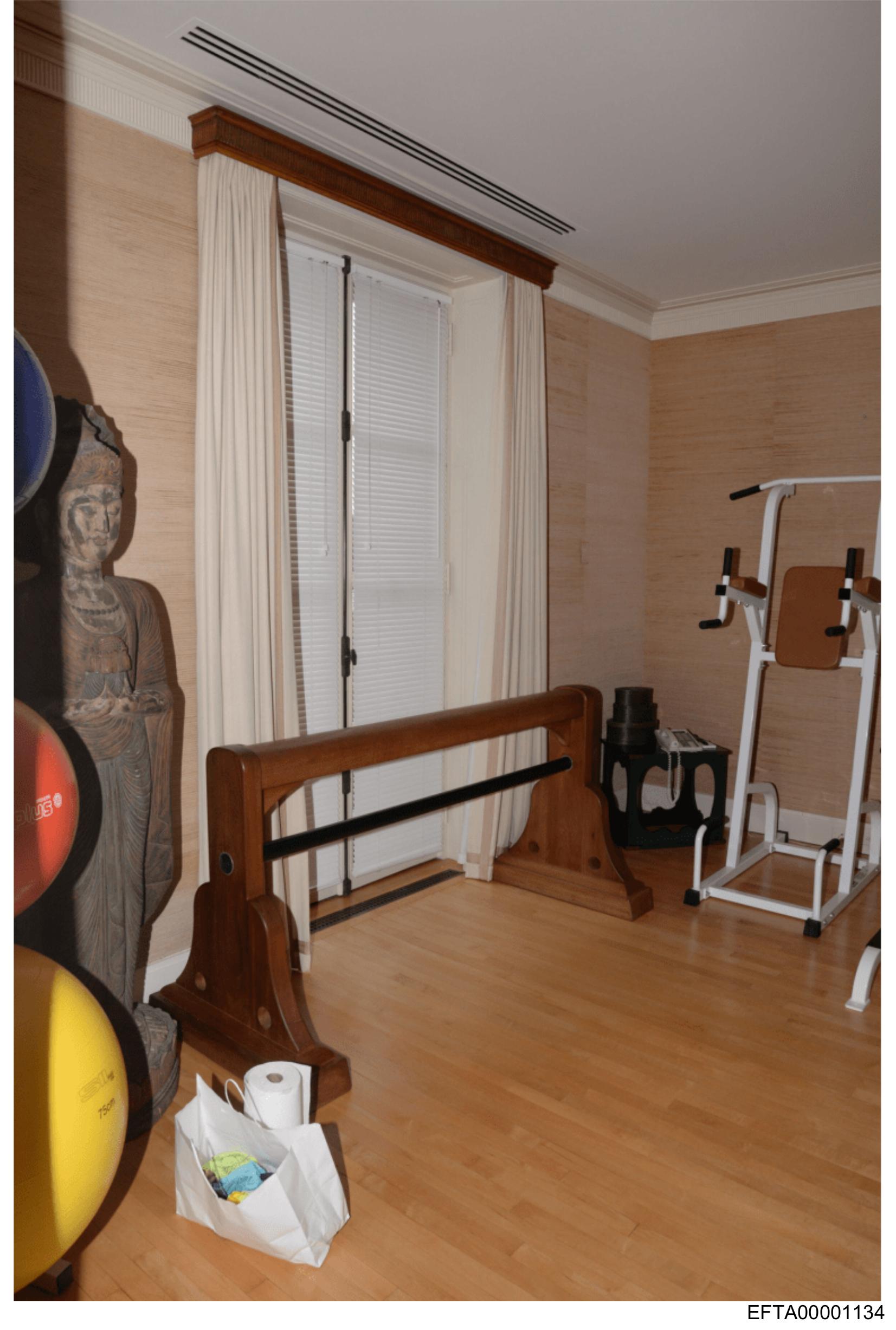 This is a photograph of an interior space that appears to be a gym. The room has light-colored walls and flooring, and there's a prominent white window frame with curtains partially drawn back. On the left side of the image, there are various pieces of exercise equipment including what looks like a weight bench and free weights. In front of this area is a piece of resistance training equipment, possibly an old-fashioned squat rack or bench press machine. On the right, there's another piece of exercise equipment that might be used for sit-ups or crunches. The lighting in the room appears to be artificial, and the ceiling has horizontal beams with a textured finish. There are no texts, people, or distinctive locations visible in this image.