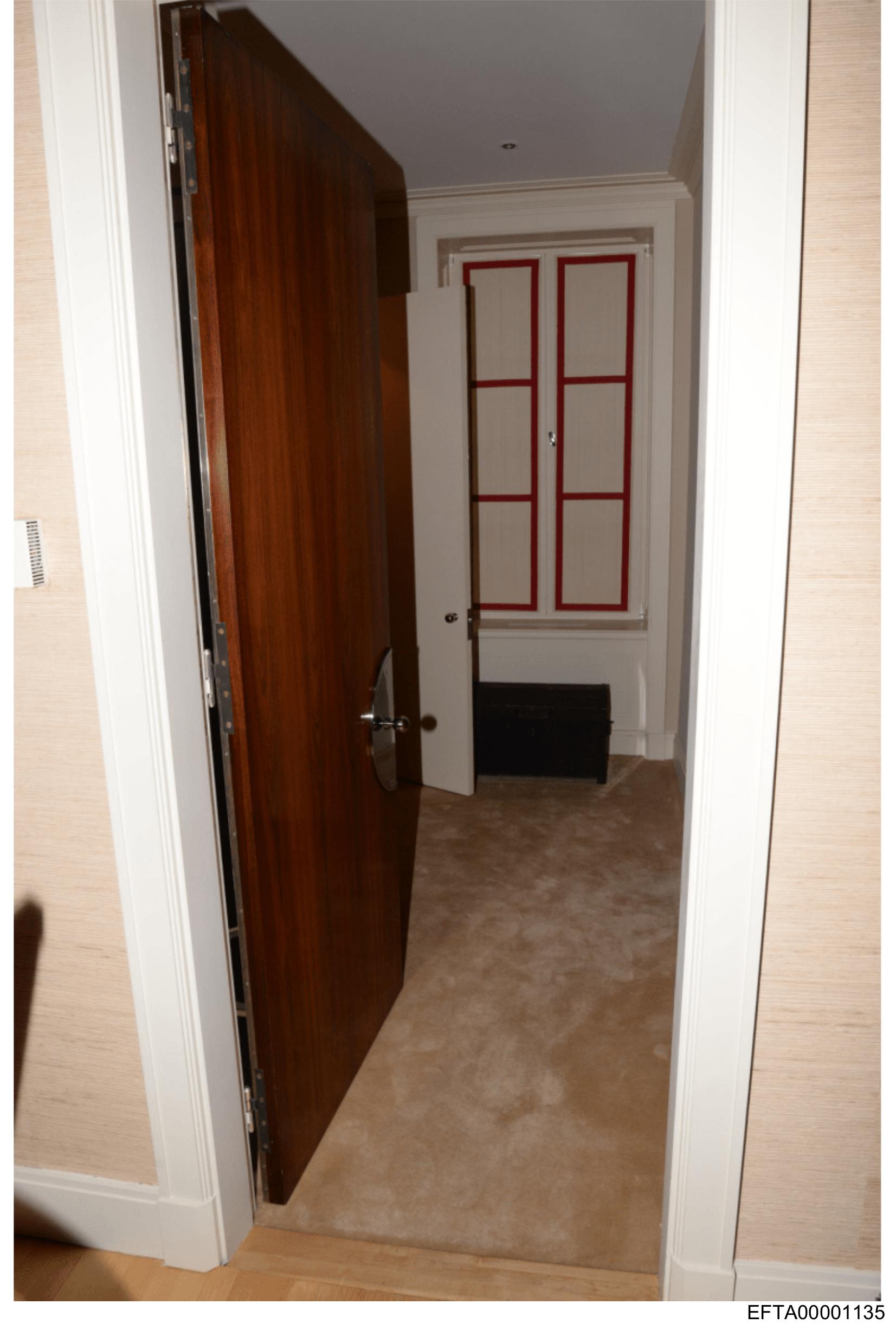 This is an interior photograph showing a doorway leading into a room with hardwood flooring and what appears to be a carpeted area under the door.