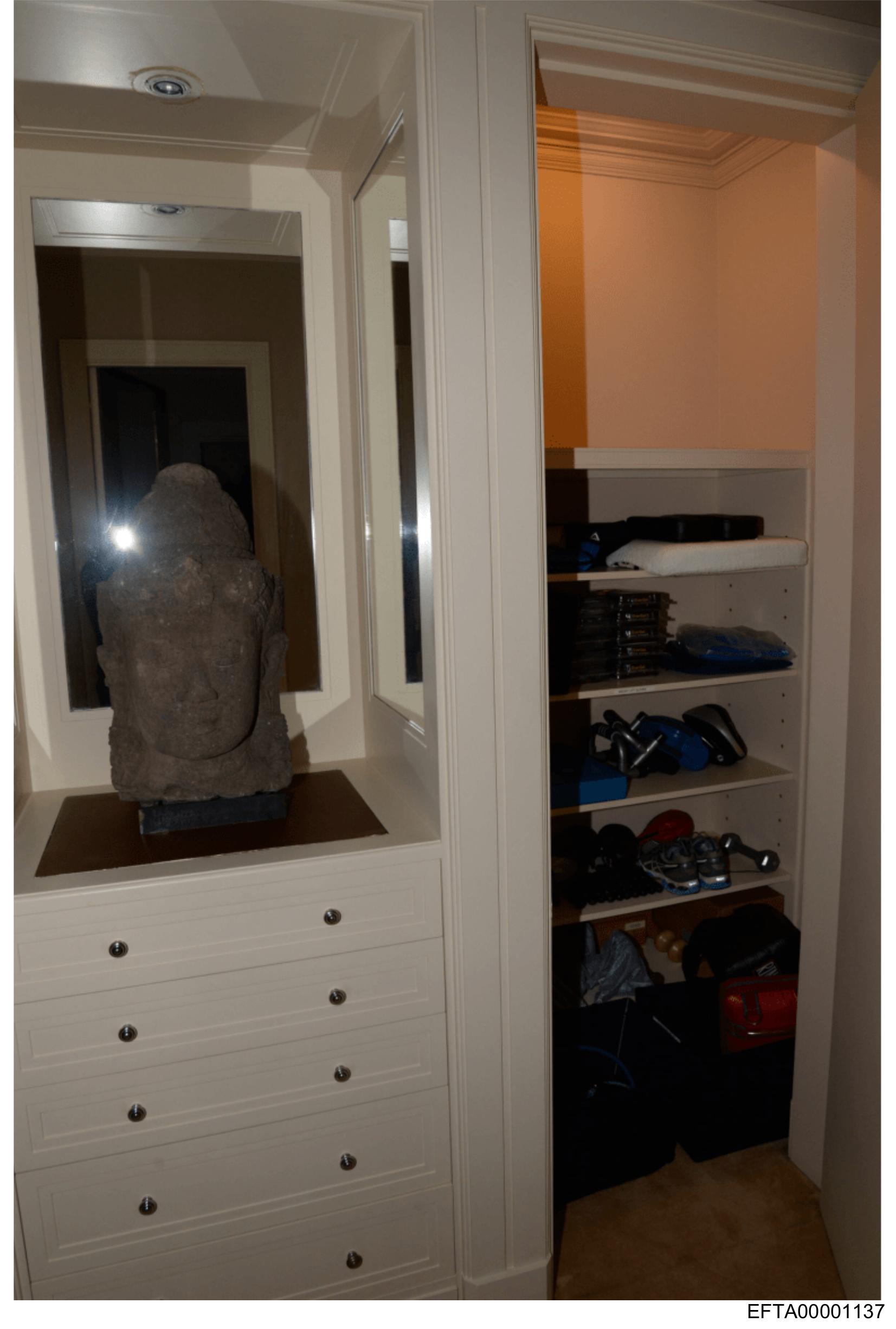 The image shows a small room with an open closet on the right side of the frame. The closet is packed with various items, including what appears to be luggage and bags. On top of one of the suitcases, there's a statue of a seated figure. The room has a neutral color palette, predominantly white for the walls and ceiling, while the furniture is light-colored as well. There is no visible text or recognizable locations in this image. The style of the photograph seems candid and informal, possibly taken to document the contents of the closet rather than for artistic purposes.