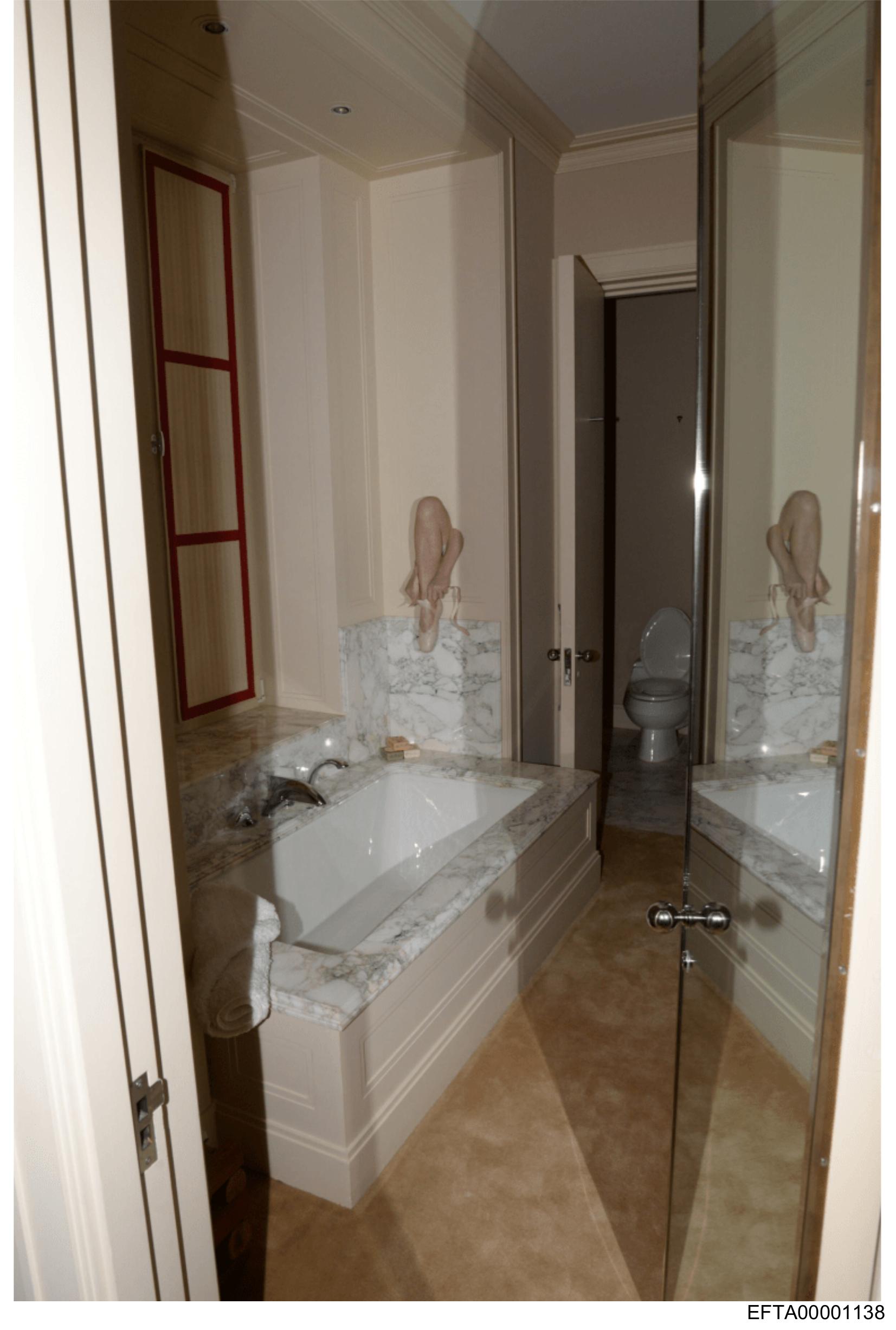 The image depicts an interior bathroom scene with a large mirror and marble surfaces. The perspective is from someone standing within the room, as indicated by the reflection of their feet in the mirror. A partial view of what appears to be a bathtub can be seen on the left side. There are no visible texts, people, or significant objects that stand out in this description. The style of the image is a standard photograph with a focus on interior design elements.