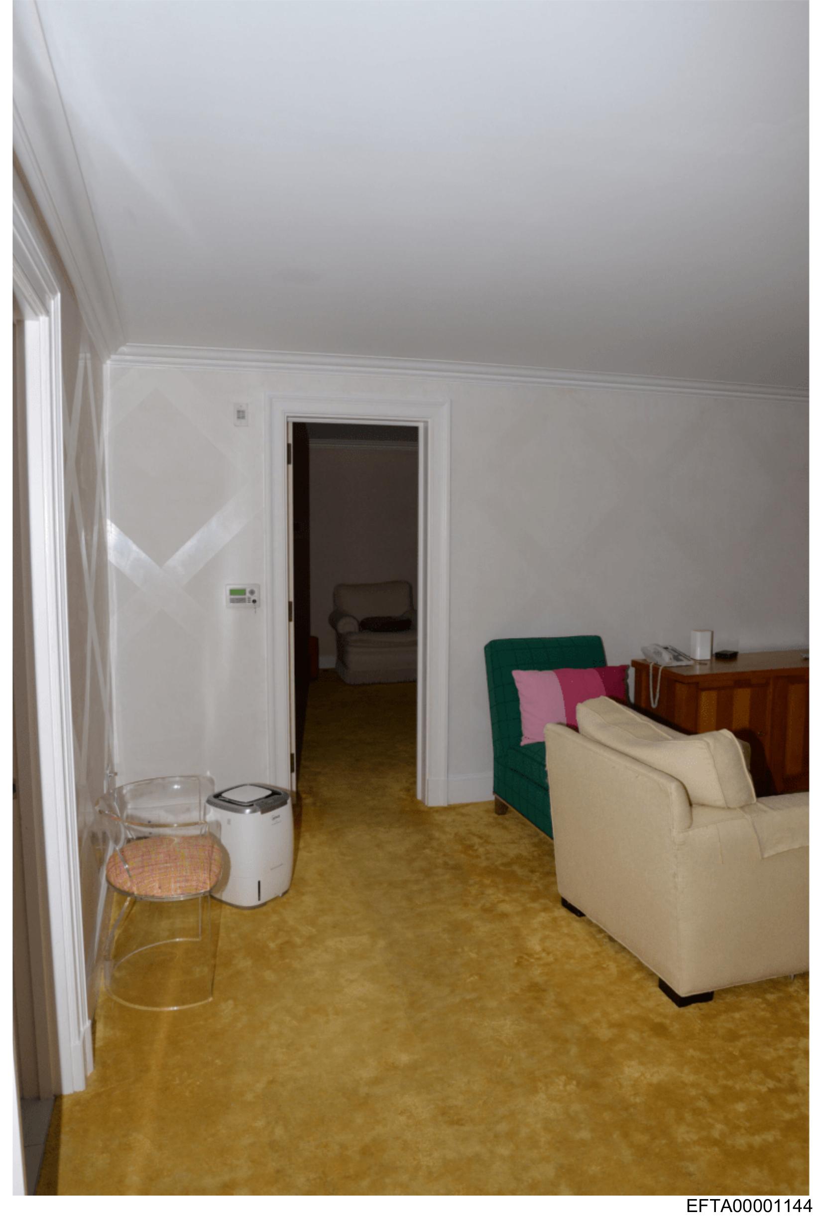 The image shows an interior space that appears to be a living area of a home. There is a doorway leading into another room with a white wall and a dark surface that could be furniture. In the foreground, there's a sectional sofa upholstered in a light-colored fabric, placed on a brown carpeted floor. To the left, there is a small circular side table with what looks like a lamp or a small appliance on top of it. The walls are painted white and have a simple design. There is no visible text or people in the image.