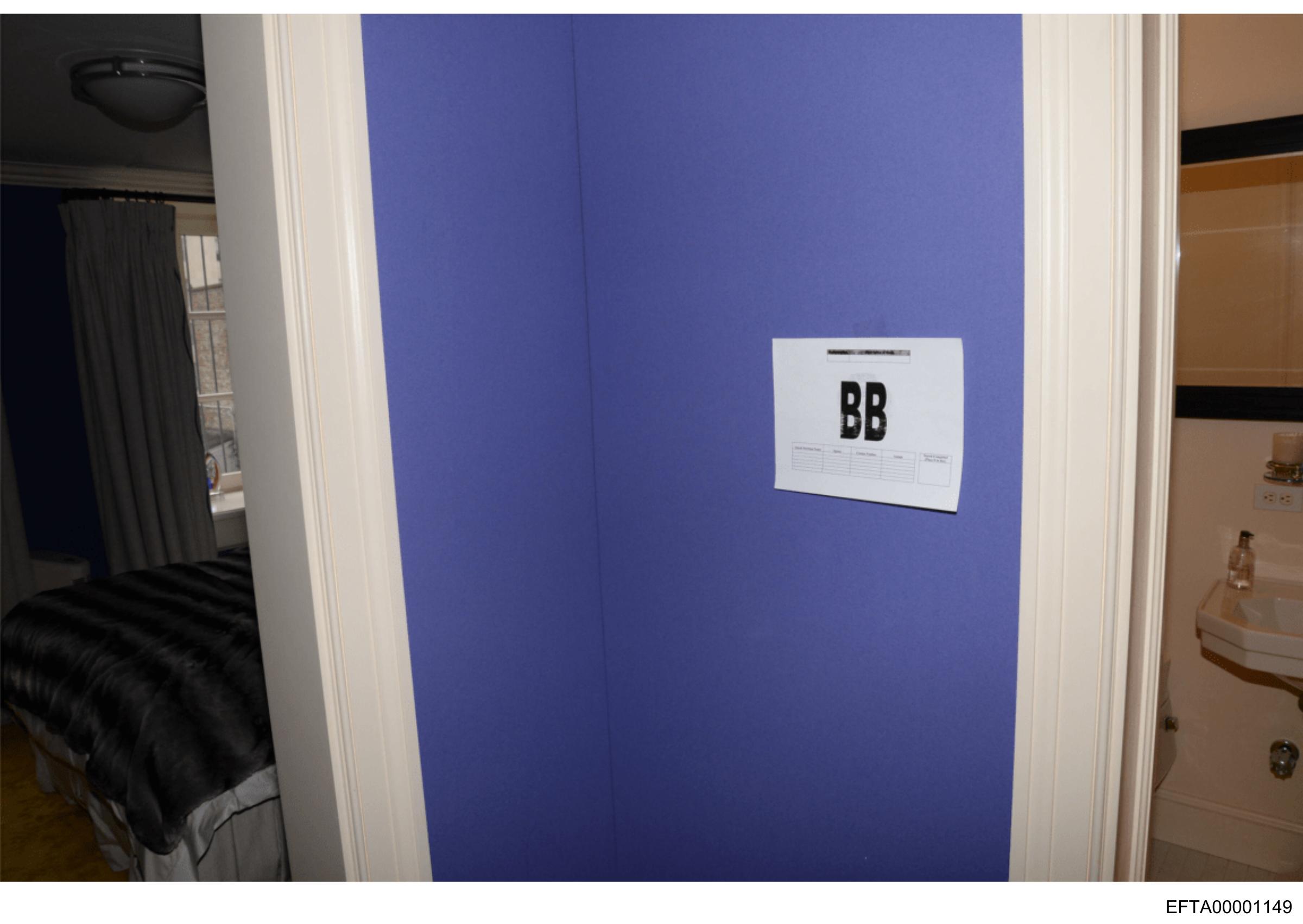 The image features a door with a label that reads "B" prominently placed on it. The door is set within a frame painted in a contrasting color to the wall, which appears to be a deep blue hue. Adjacent to the door, there's a glimpse of what looks like a bed or bedding covered with a dark-colored cloth, suggesting the location could be a bedroom. On the bottom left corner of the image, there's a watermark or text that says "IMG_1245," indicating the filename of this photograph. The overall style of the image is candid and seems to capture an everyday scene without any particular artistic effect applied to it.