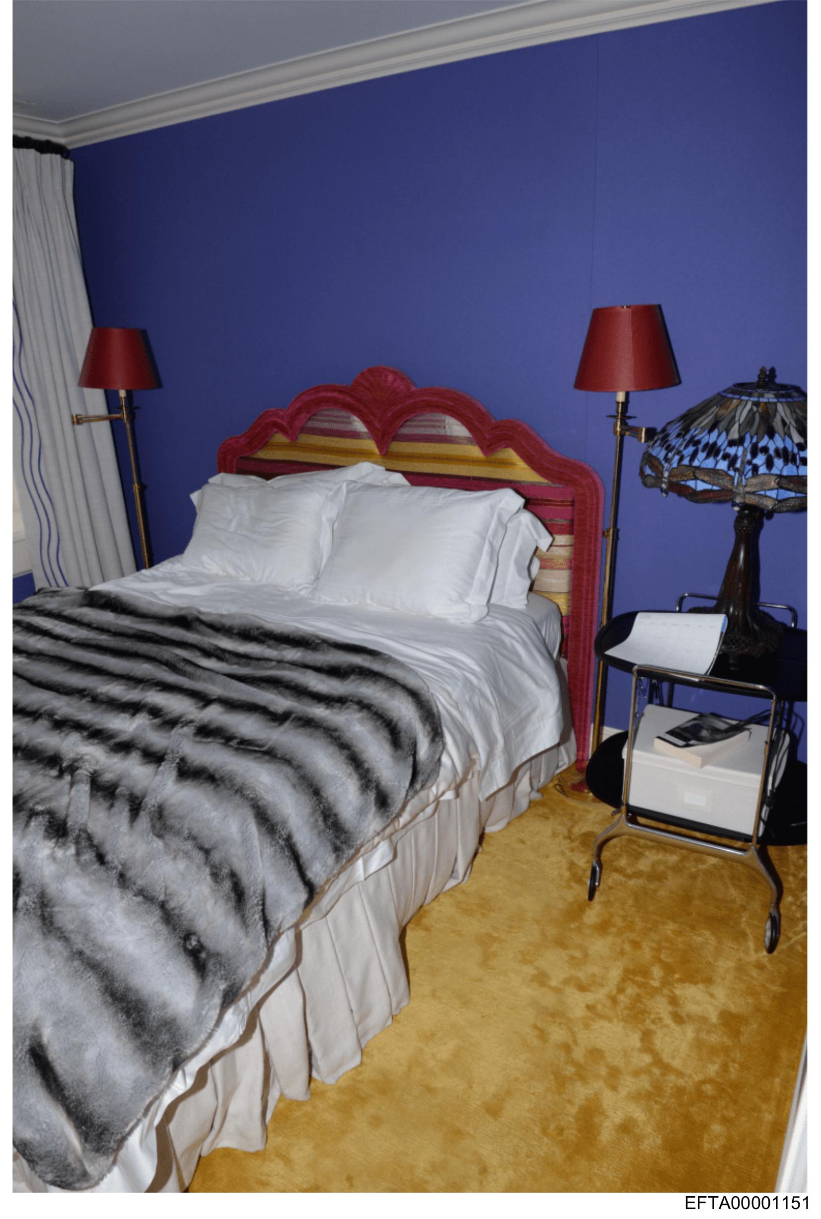 The image depicts a room with a large bed covered by a luxurious fur throw blanket and multiple pillows. To the left of the bed stands a nightstand with a lamp that has a red lampshade. The walls are painted in a deep blue hue, adding to the overall opulence of the space. There is a person partially visible on the right side of the image, but their presence is not significant and they seem to be standing by the door. A small portion of what appears to be a patterned carpet can be seen at the bottom left corner of the photo. There is no text present in the image. The style of the photograph is candid, with no apparent staging or professional composition; it seems more like an everyday snapshot than a carefully arranged shot.