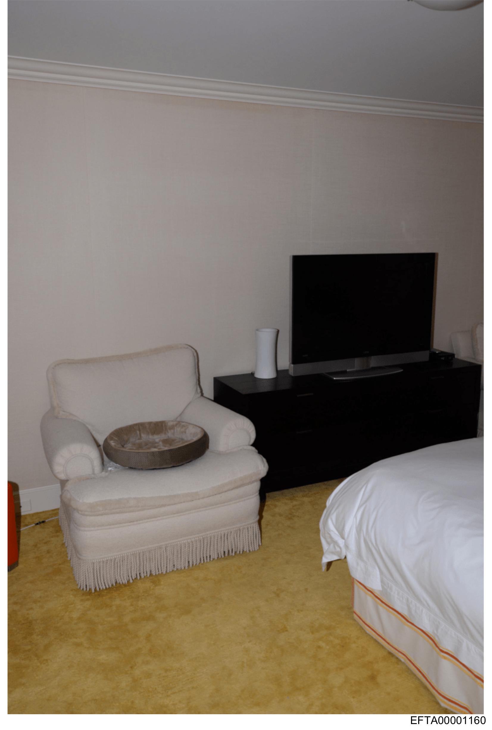 The image shows an interior space that appears to be a bedroom. There is a bed with white bedding and pillows against one wall. In front of the bed, there's a small wooden stand or dresser with what looks like a lamp on top. To the right of the stand, there's a chair with a patterned cover. The walls are painted in a light color, and the flooring seems to be carpeted. The room has a cozy, lived-in feel but is currently unoccupied by people. There is no visible text or distinctive branding in the image.