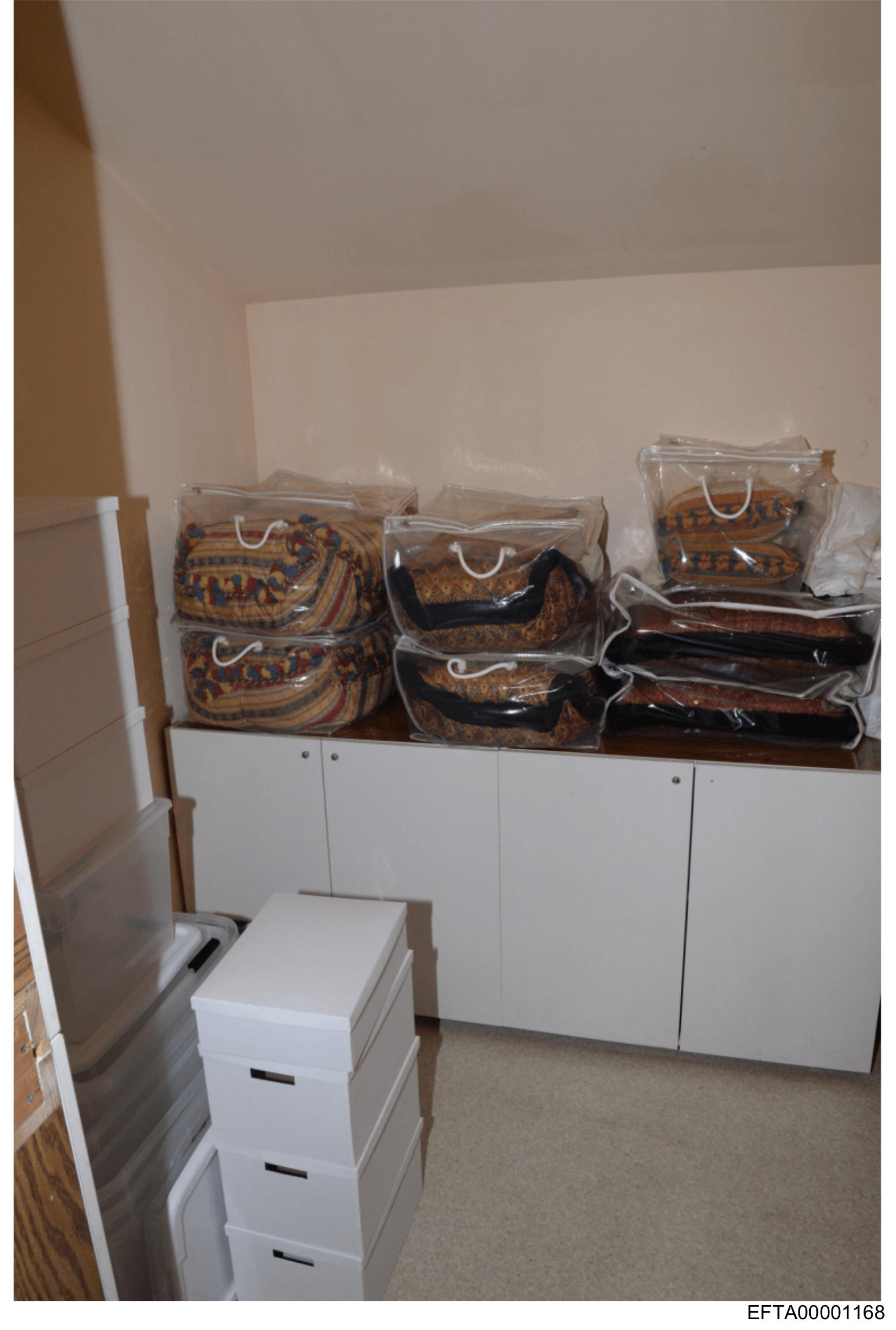 The image shows a room with white cabinets and a carpeted floor. On top of the cabinets, there are several packages wrapped in plastic, each containing what appears to be rugs or tapestries. The text "FATIMA" is visible on one of the packages, but it's unclear if this refers to a brand, location, or other context without more information. In the foreground, there is an open box that seems to contain additional items, possibly related to the packages on the cabinets. There are no people visible in the image, and the setting appears to be indoors, likely a storage area or workshop.