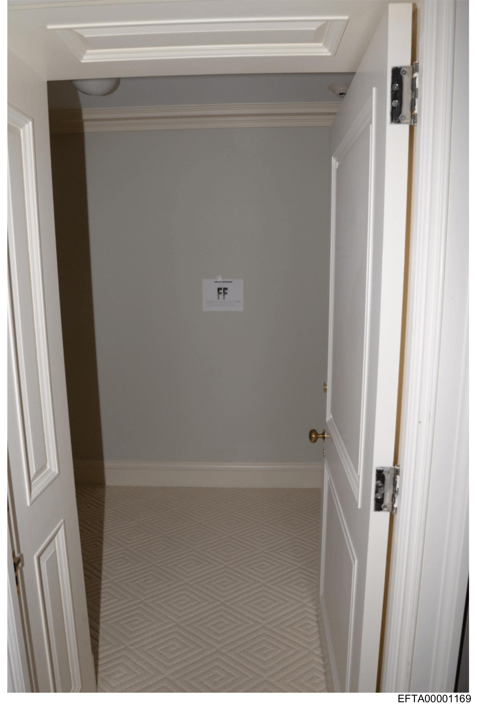 The image shows an interior hallway scene with a closed door on the left and another partially open door to the right of the frame.