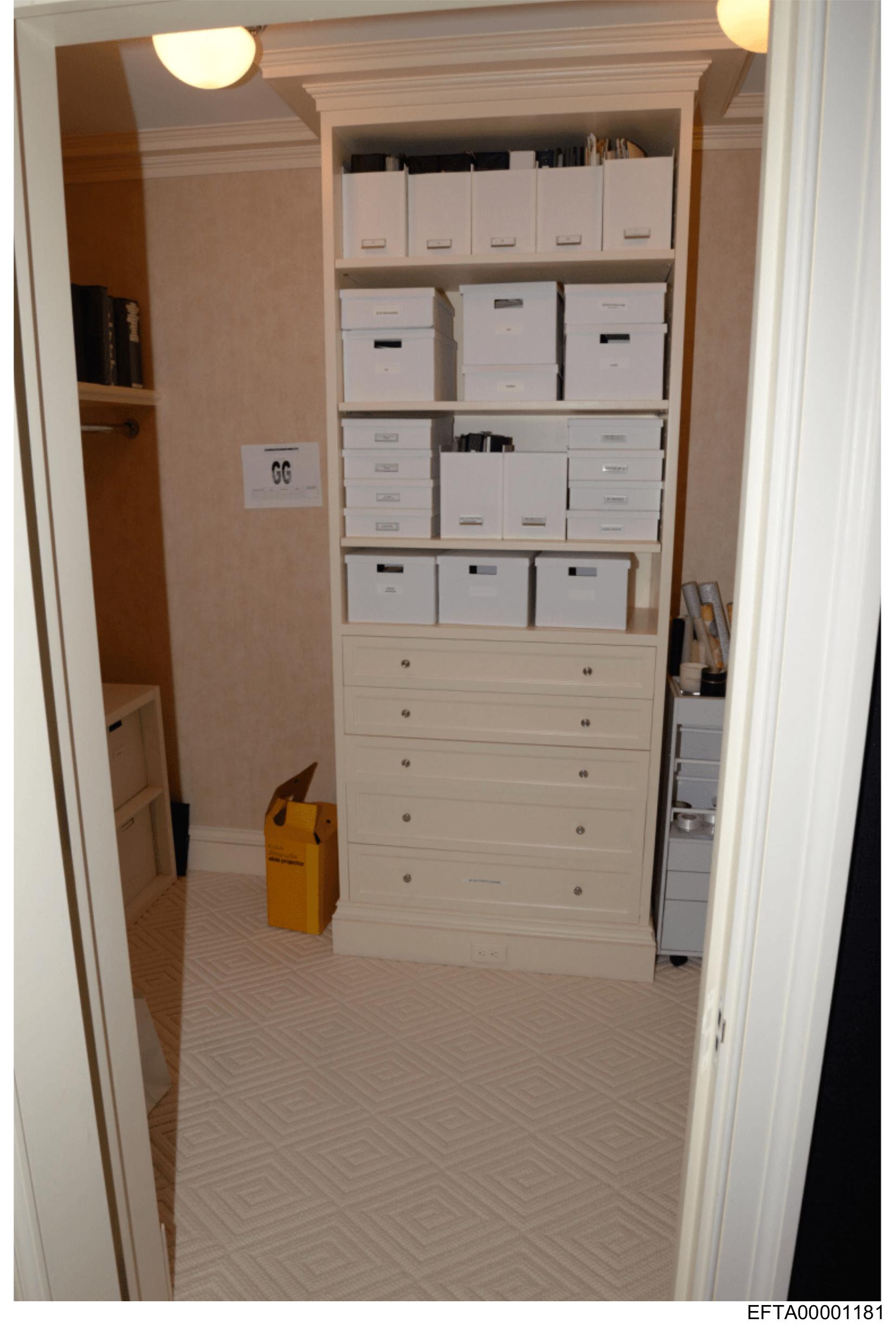 The image shows an office storage room with white walls and a light beige carpeted floor.