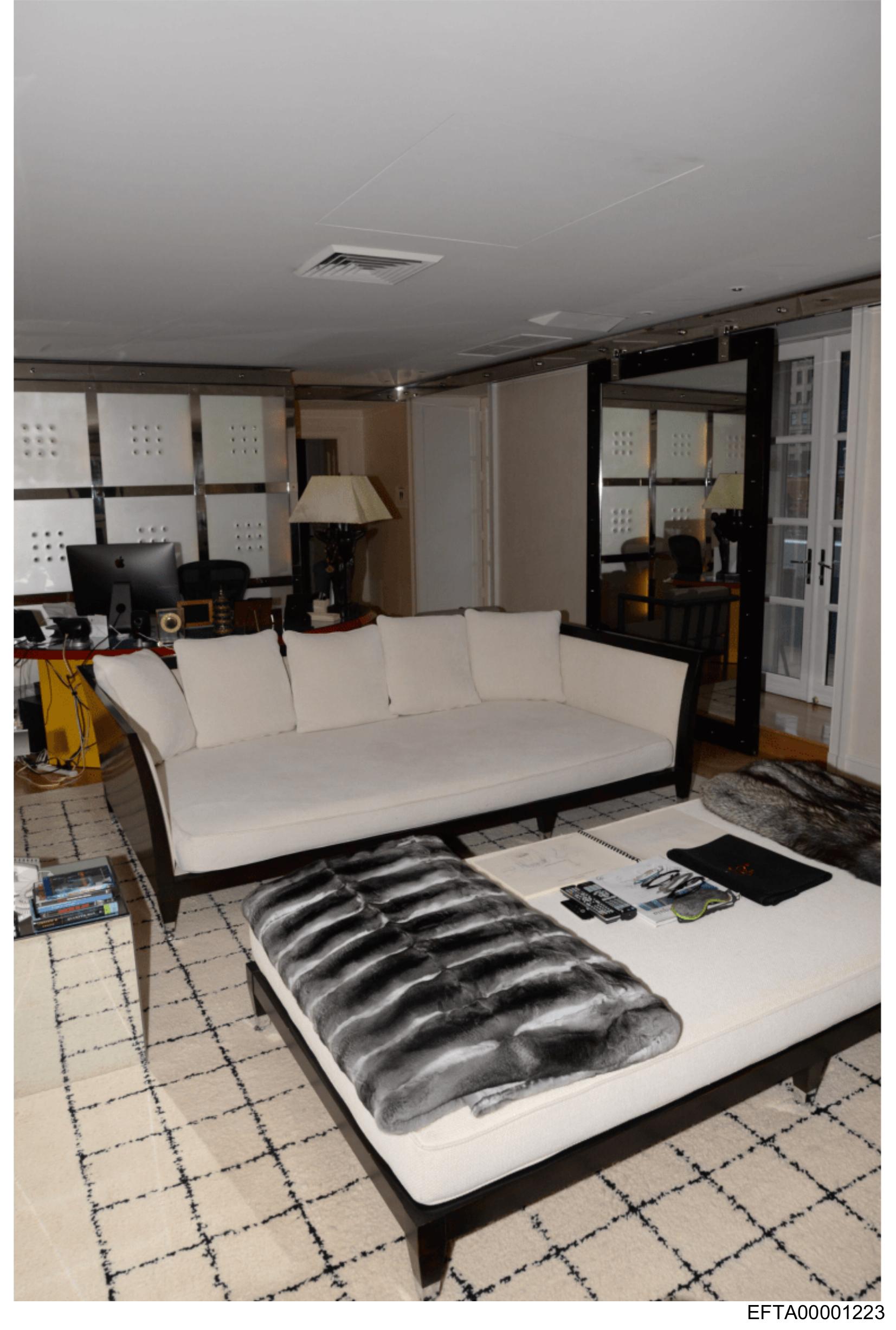 The image shows a well-lit room with modern furnishings. A large sectional sofa is arranged around a central area that includes a coffee table and an ottoman. There are decorative elements such as cushions on the couch and a patterned rug underfoot, contributing to a cozy atmosphere. The walls are adorned with artwork or photographs in frames, adding a personal touch to the space. No text, people, or specific locations are identifiable from this description.