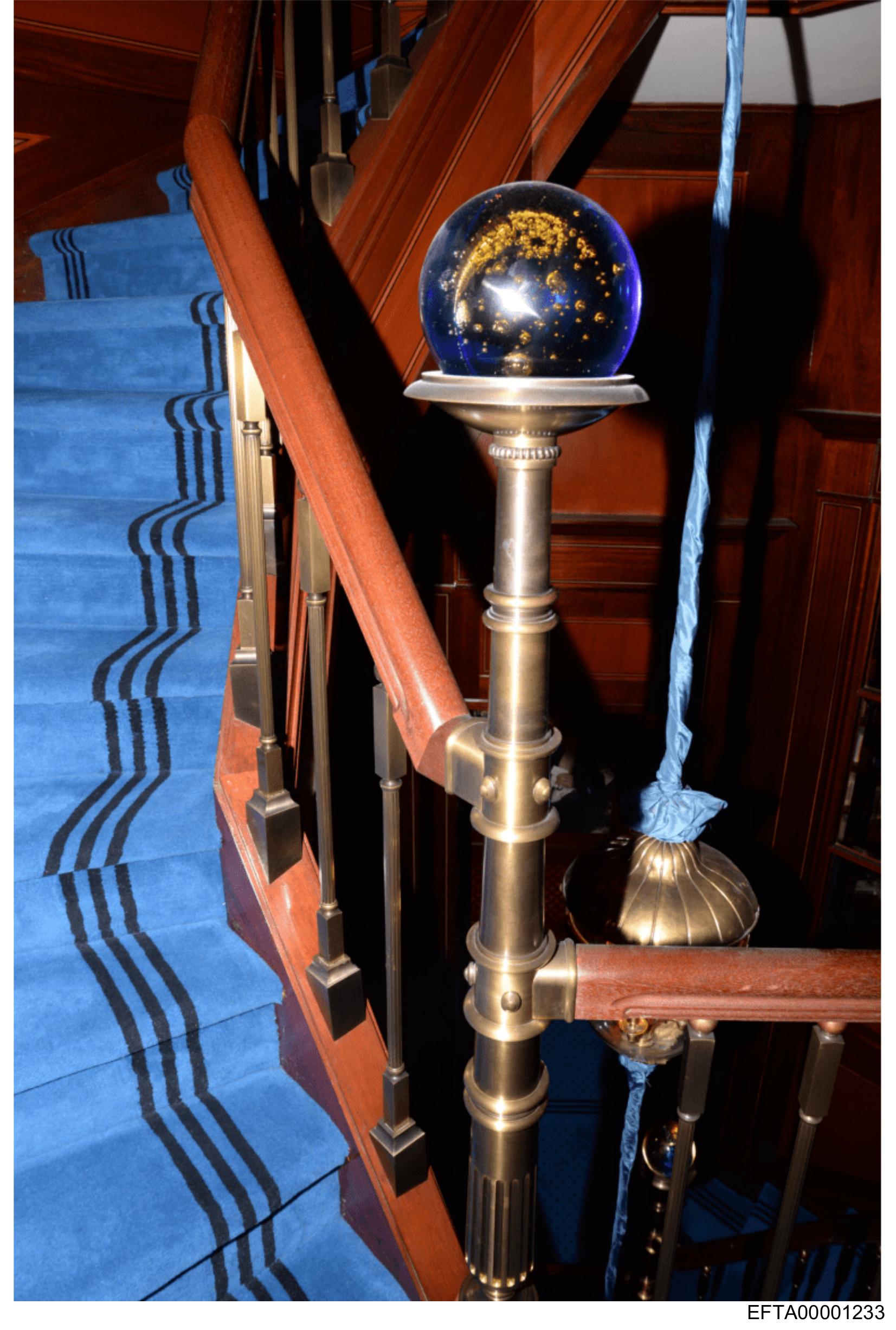The image shows a staircase with an elegant design featuring a dark banister and blue carpeting on the stairs.