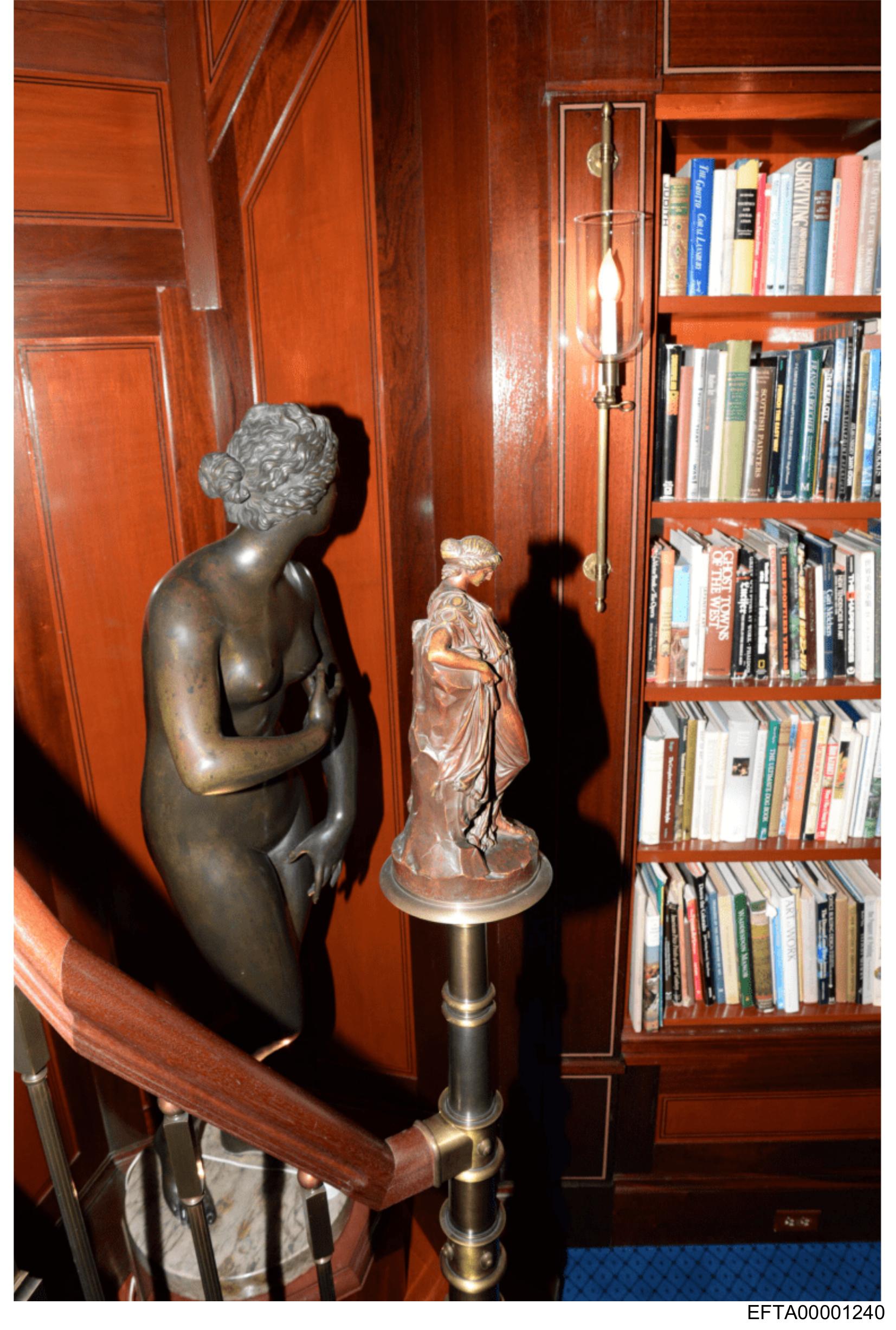 The image captures a serene scene at the top of a staircase. On either side of the stairwell, bookshelves filled with various books stand tall. The left bookshelf is adorned with two statues: one of a nude person and another that resembles a small child. These figures add a touch of elegance to the setting. To the right, the wall features an ornate wood paneling, enhancing the overall aesthetic appeal of the space. The stairwell exudes a warm ambiance, inviting one to explore the stories held within its walls and shelves.