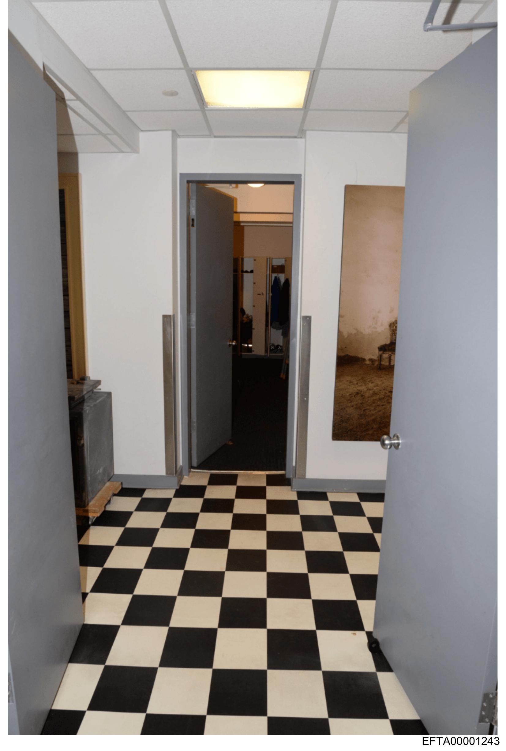 The image shows an interior space viewed from a doorway with a wide frame around the edges. The floor features checkerboard linoleum tiles in alternating black and white squares. On the right wall, there's a closed door with its upper section covered by what appears to be a frosted glass pane. Above this area, on the ceiling, there are two visible fluorescent light fixtures. There is no text or people present in the scene, and the style of the image resembles that of a photograph with a focus on architectural details.