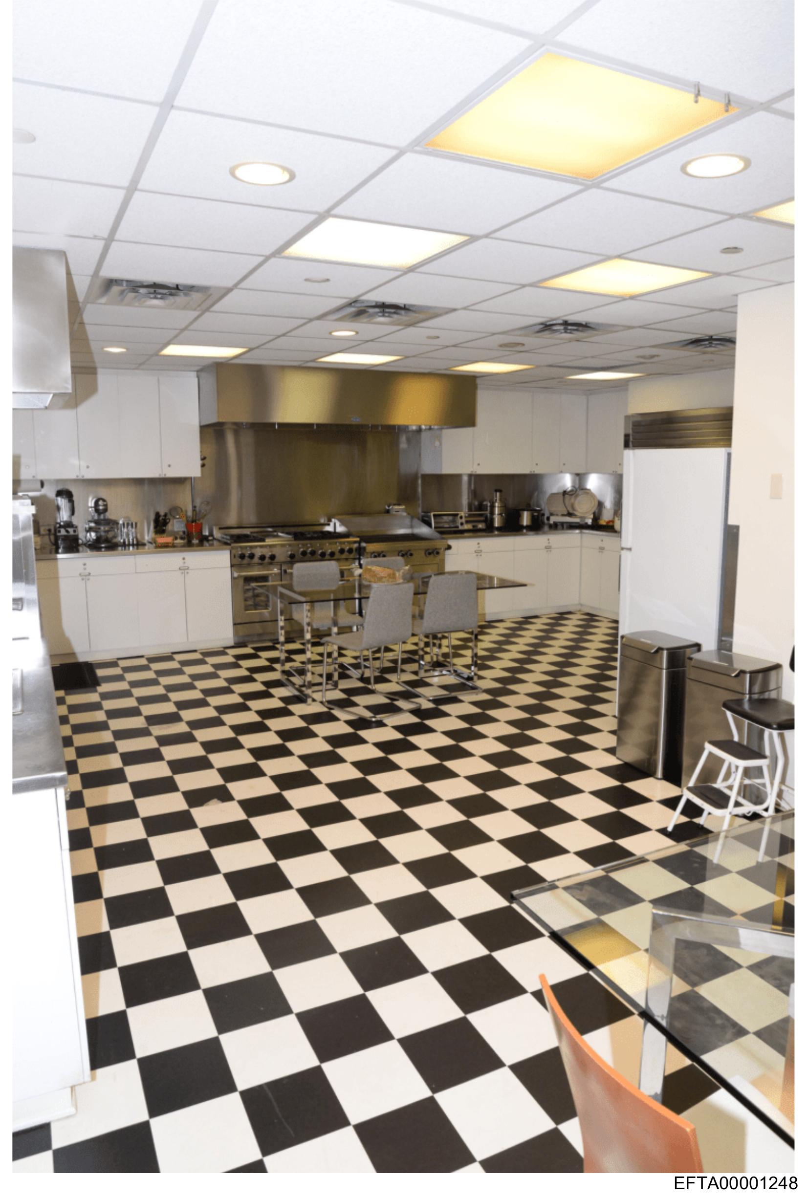 The image shows an interior view of a kitchen with a distinctive black and white checkered floor design.