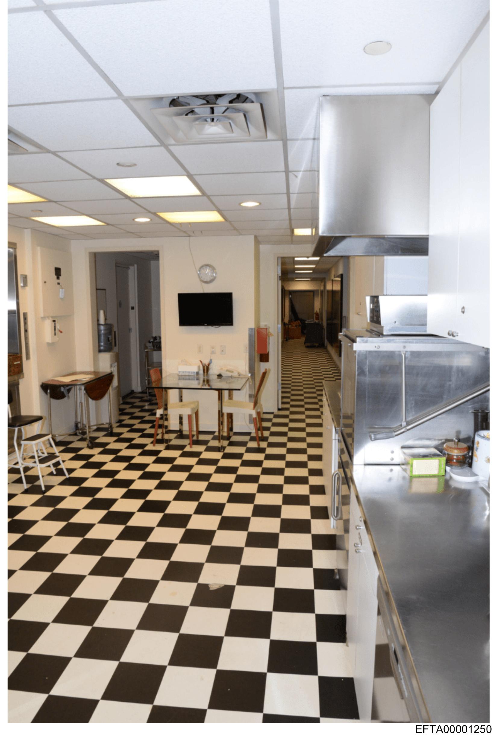The image depicts an interior space that resembles a kitchen with a distinct design. The floor is covered with black and white checkered tiles, giving the room a classic diner aesthetic. On the left side of the photo, there's a large stainless steel appliance that could be a refrigerator or freezer, as well as another smaller oven or stove. To the right, we can see part of what appears to be a metal countertop, possibly with a backsplash above it. There is no text visible in the image. No people are present; the space seems empty except for the furniture and appliances. The style of the image suggests that it may have been taken with an analog camera or processed to look like an older photograph.