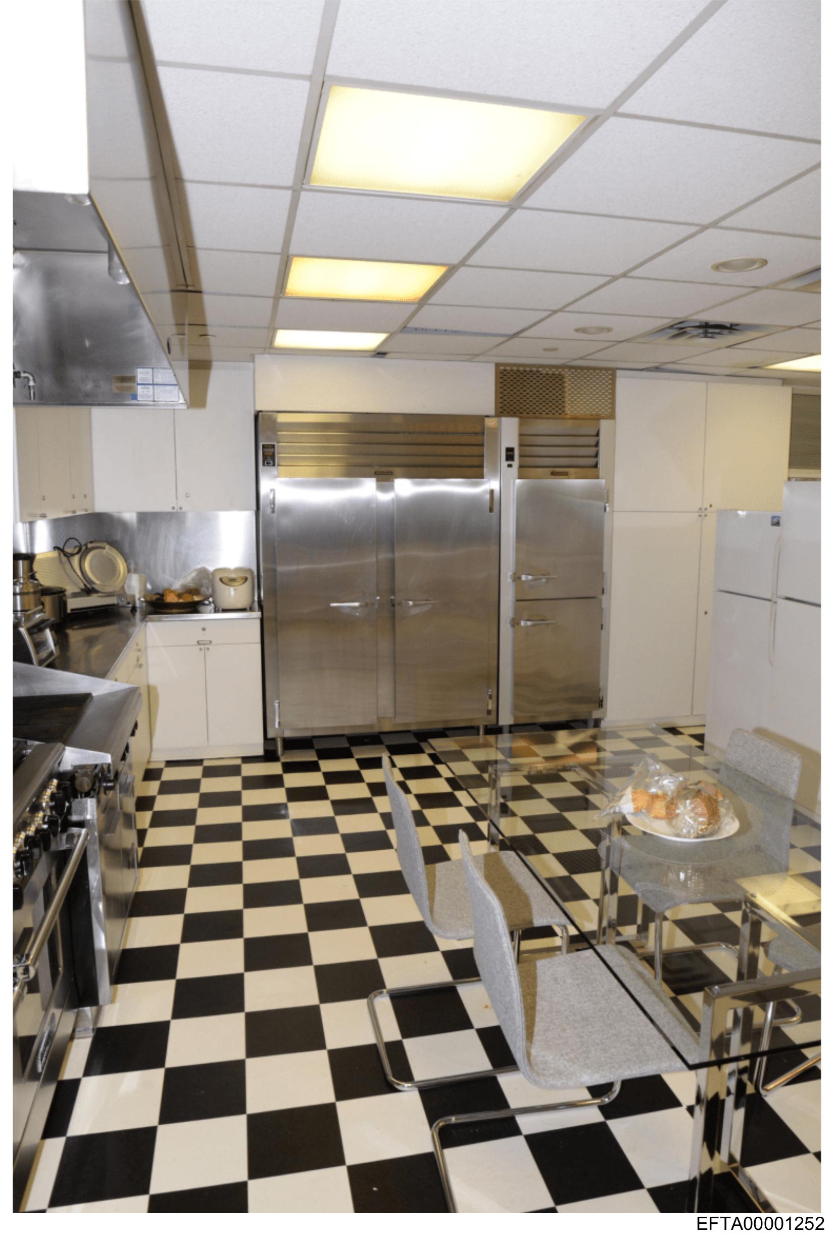 The image shows an industrial kitchen with a black and white checkered floor.