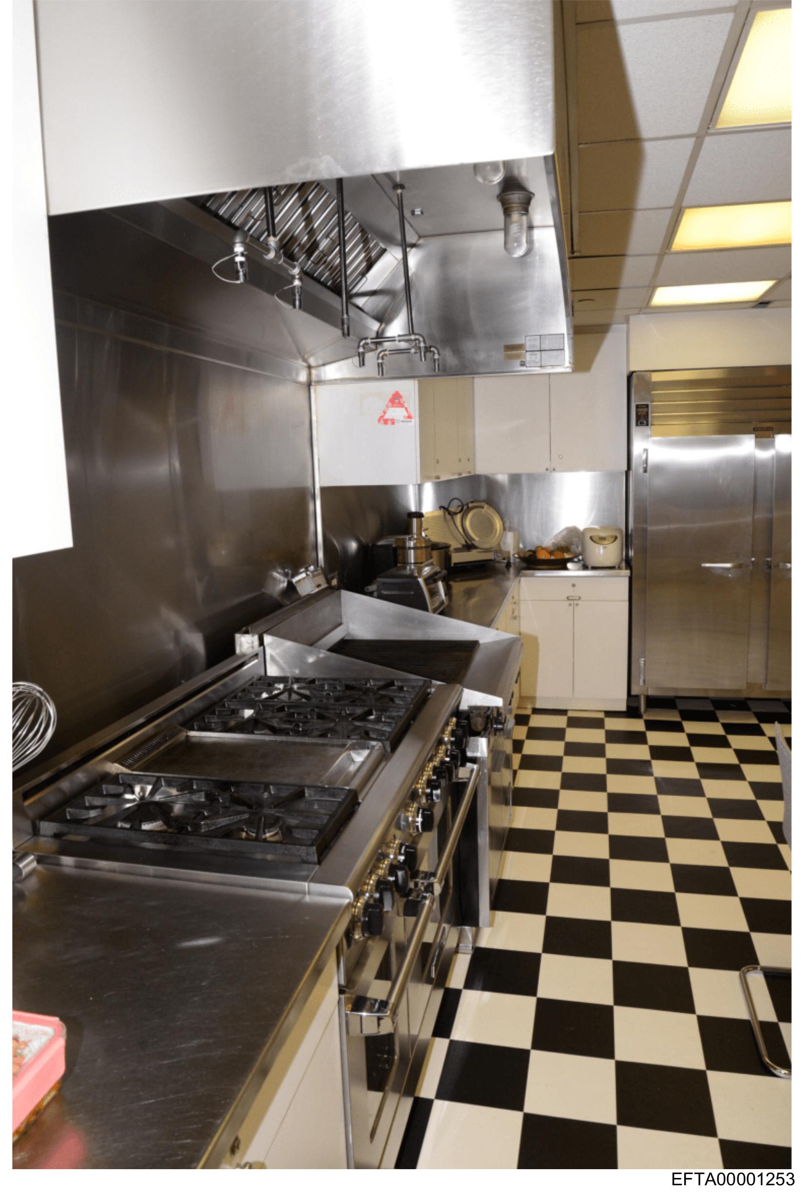 The image shows a professional kitchen with stainless steel appliances and cabinets.