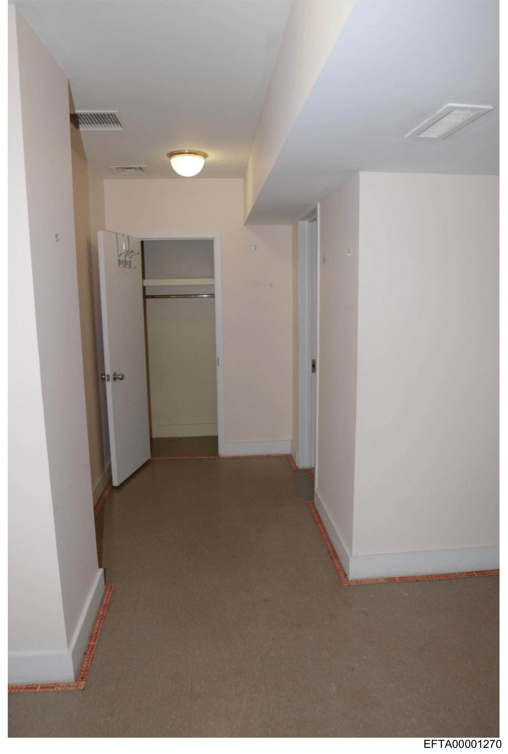 The image shows an indoor hallway with a simple design and minimal furnishings.