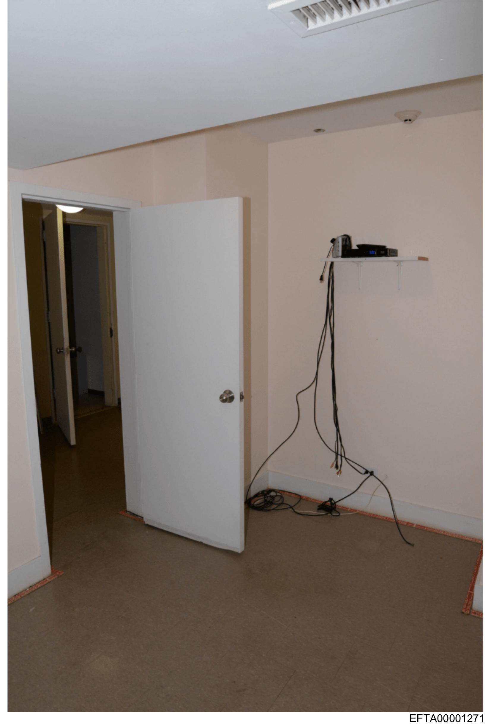 The image shows an interior room with a door that is partially open. The door has a glass pane through which part of another room can be seen. There are several cables and wires on the floor near the base of the wall, extending out from under the door. The style of the image is candid and appears to be taken in a residential setting, possibly during a move or renovation given the presence of the tangled cords.