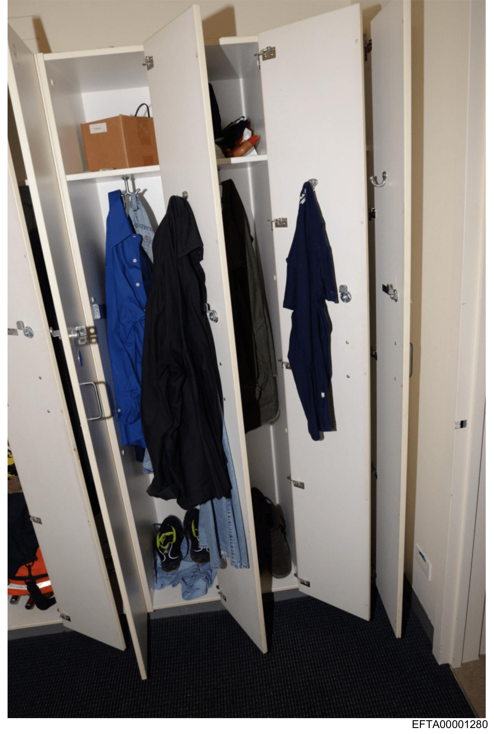The image displays an indoor setting with a row of lockers on the left side. The lockers are open and filled with various items such as jackets, bags, and other personal belongings. There is no visible text within the image, nor are there any people present in the scene. The style of the photograph appears to be candid, possibly taken during a casual visit or an informal event. The focus seems to be on capturing the daily items stored in these lockers rather than showcasing any specific location or individual.