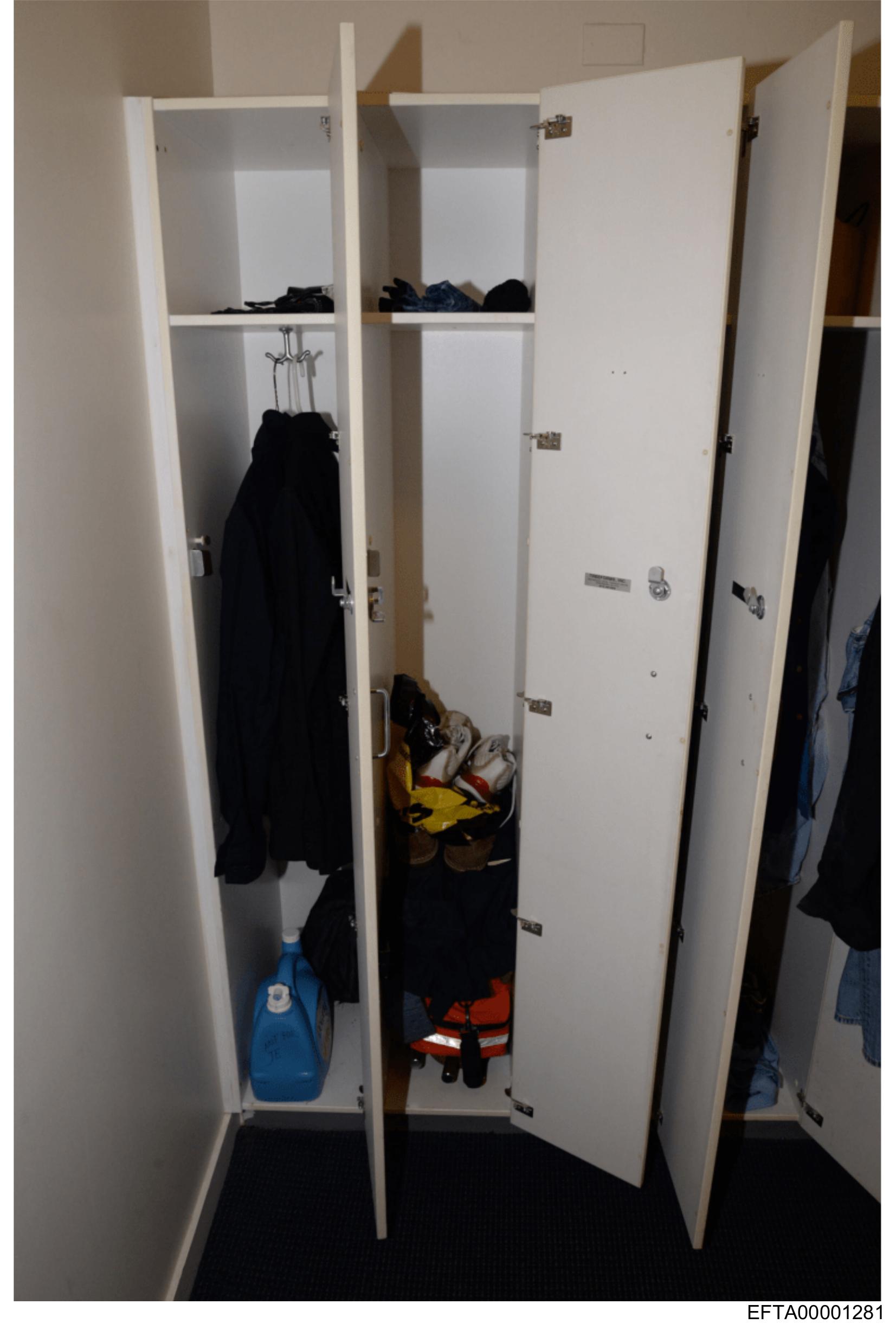 This is an image of a storage unit with its doors wide open. The interior shelving units are filled with various items that appear disorganized. There is no visible text on the image, and no identifiable people or specific locations can be discerned from this viewpoint. Significant objects include what looks like a blue container at the bottom left corner of the shelves and personal belongings scattered throughout. The overall condition of the space suggests it has been used for storage but not recently organized or maintained.