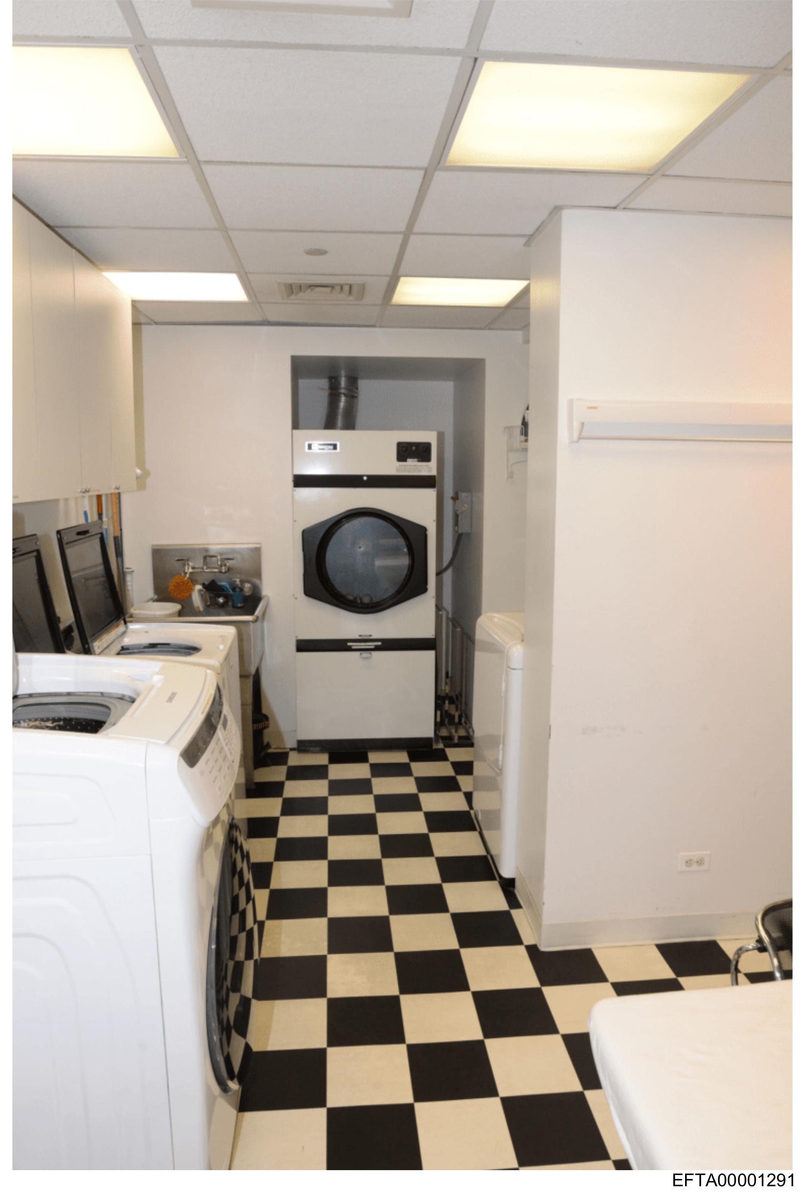 The image shows an interior space that resembles a laundry room with a distinctive design. There's a white front-loading washing machine on the left and a dryer to its right, both set into cabinets. The floor has black and white checkered tiles. The ceiling appears to have fluorescent lighting fixtures installed at regular intervals. On the right side of the image, there is a partial view of a counter with what seems to be a sink and possibly a dishwasher behind it. The overall setting suggests this could be a part of a larger facility such as an institution or a commercial establishment where laundry services are provided.