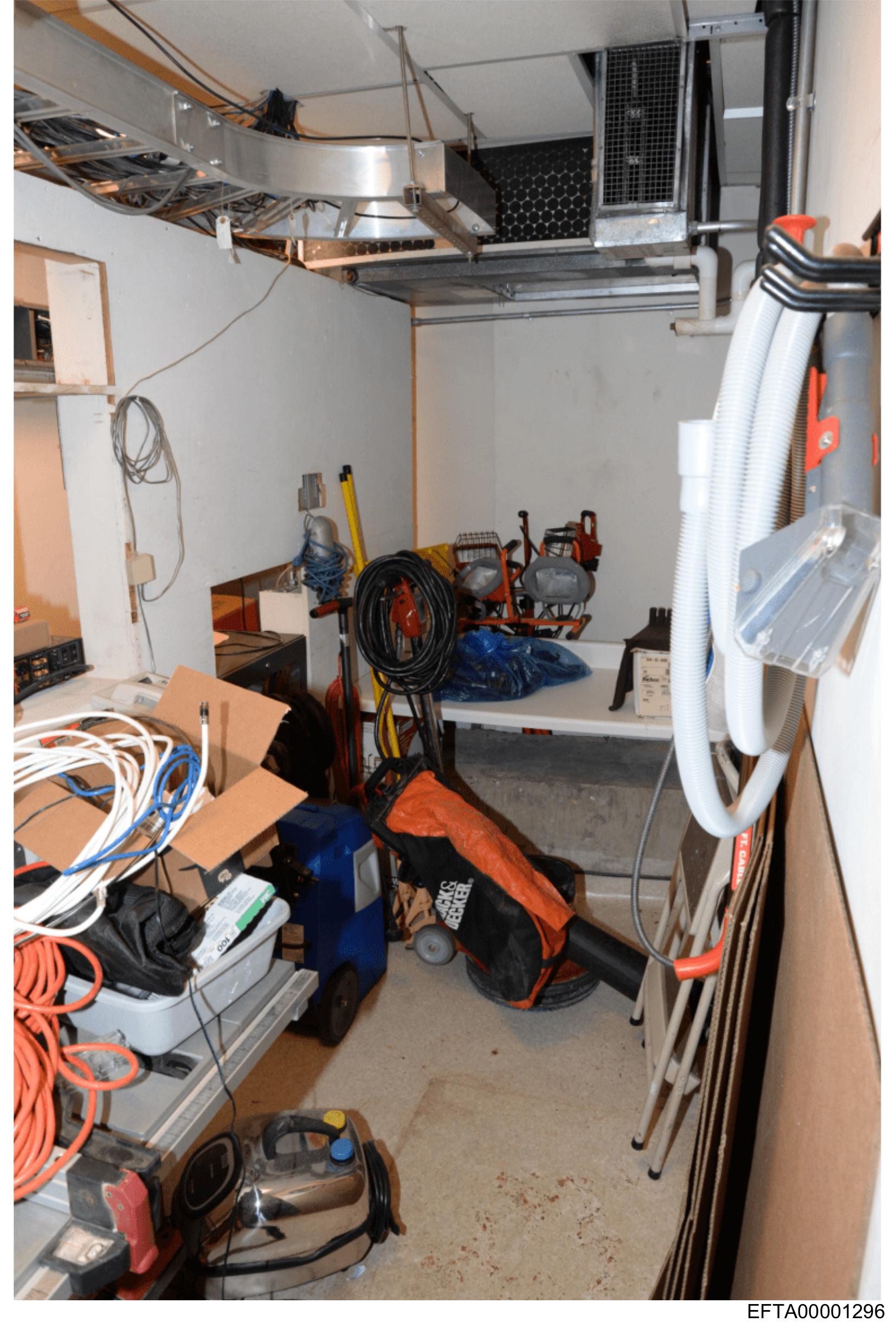 This is a photograph of an indoor space that appears to be a storage area or workshop. There are various tools and equipment scattered around, including what looks like power cords, extension cords, and possibly some construction materials. The ceiling has exposed ductwork, indicating the space might be part of a larger building or commercial property. On the right side, there's a large object that resembles a piece of machinery, but its exact function is not clear from this angle. There are no people visible in the image.