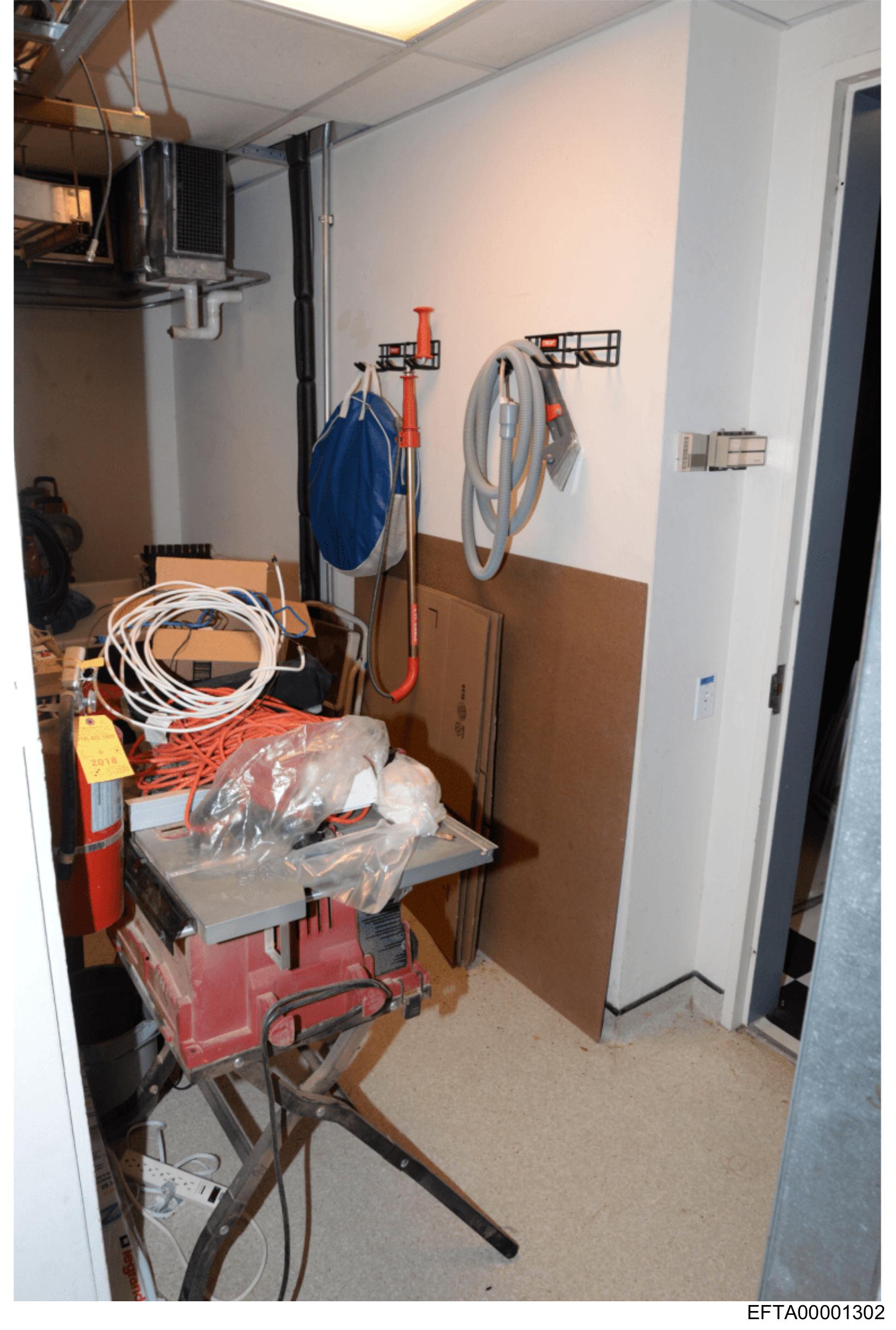 The image shows an interior space that appears to be a utility room or storage area with various equipment and tools.