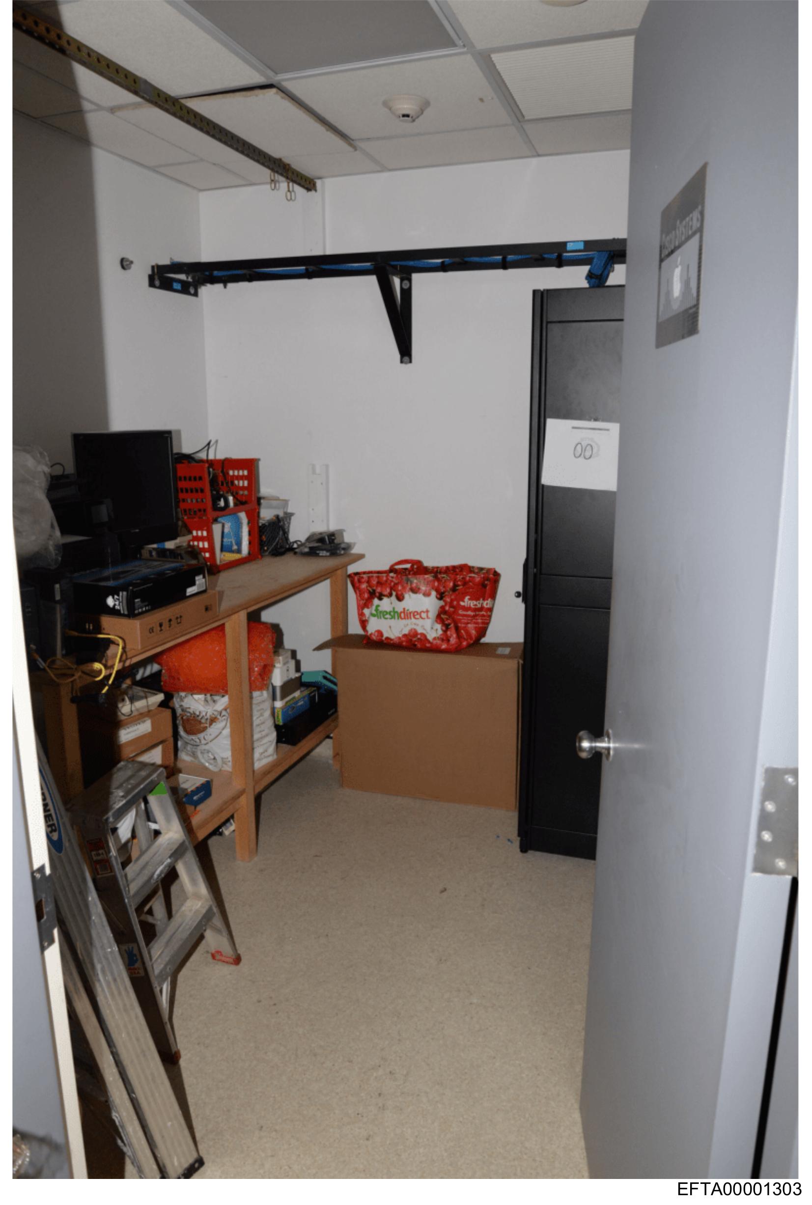 The image shows a room that appears to be cluttered with various items. There is an open closet door on the right side of the photo, revealing some shelves and stored boxes. A desk with computer equipment is partially visible on the left, suggesting this could be an office or a workspace. On the wall opposite the desk, there's a sign with what looks like a logo or symbol, but it's not entirely clear due to the image quality. The room has a drop ceiling and exposed pipes, indicating it might be part of an older building or one designed for practicality rather than aesthetics. There is no text that can be confidently read from this image.