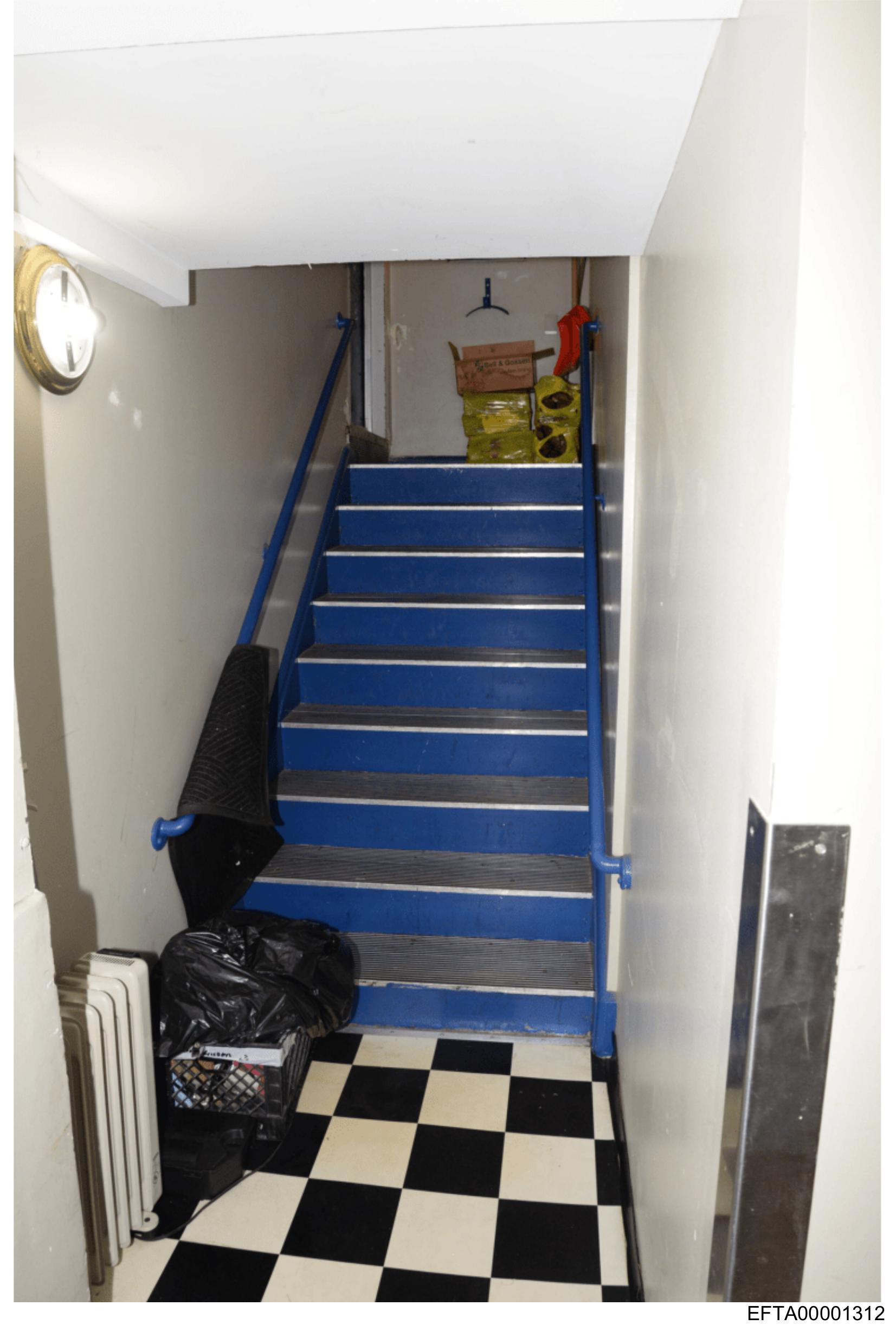 The image depicts an interior space featuring a staircase with blue treads and risers.