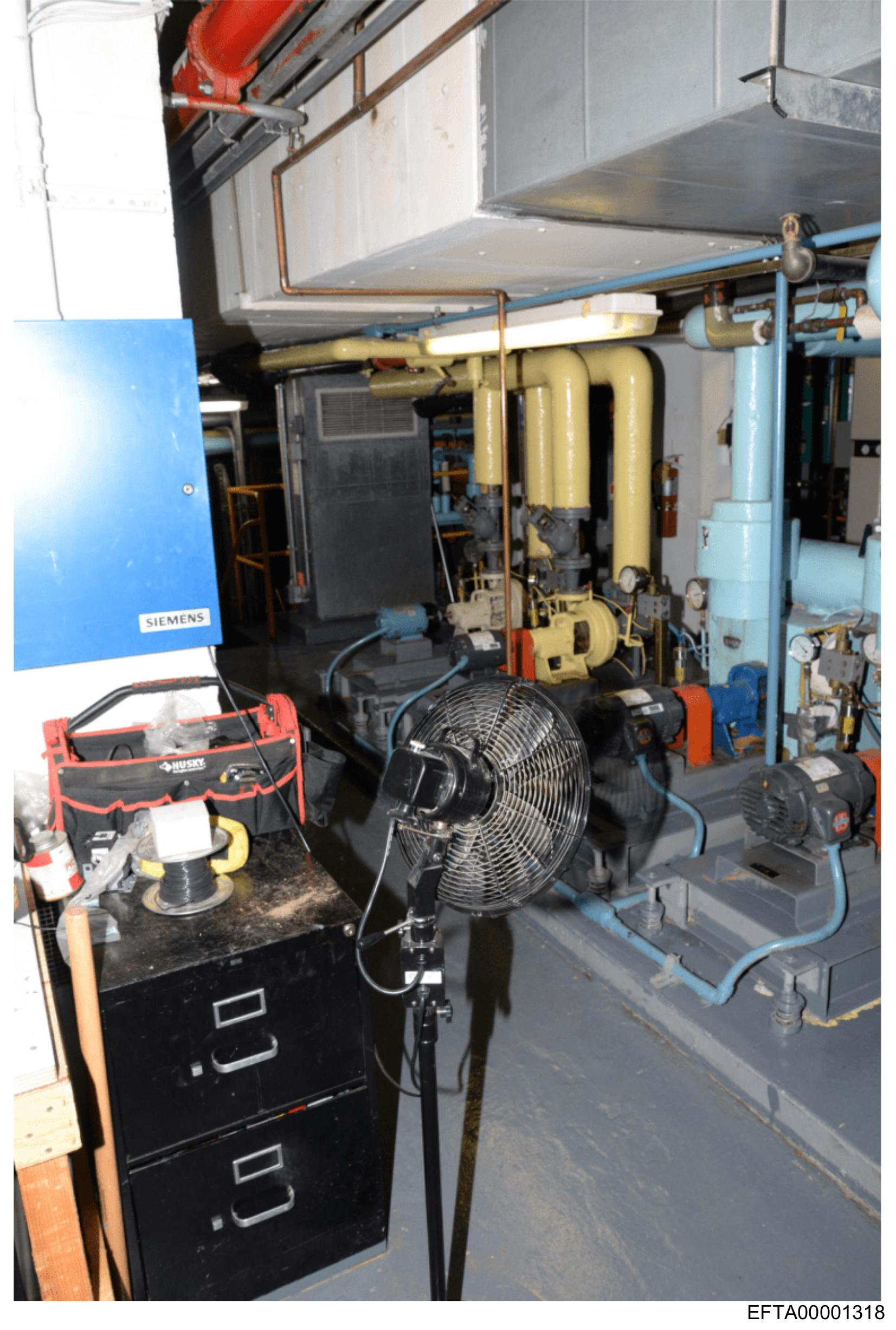 This is a photograph showing the interior of an industrial setting. The room has exposed pipes and ductwork on the ceiling, suggesting it might be a workshop or a part of a larger manufacturing facility. In the foreground, there is a microphone stand with no one standing behind it, indicating that the image may have been captured during a break in activity or before the start of an event, such as a performance or presentation. There are various pieces of machinery and equipment visible, including what appears to be a pump or compressor unit. The lighting is artificial, coming from overhead fixtures, which casts shadows and gives the space a somewhat dim ambiance. No text is clearly readable in this image.