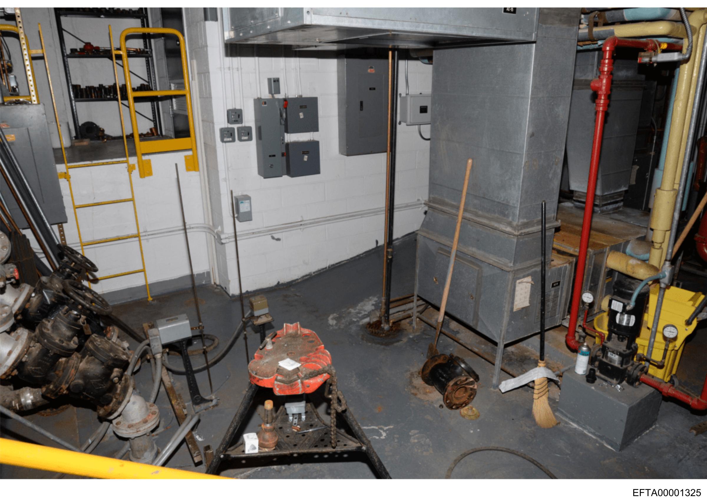 The image depicts an industrial setting with various pieces of machinery and equipment scattered around. The room has a utilitarian look, with concrete flooring and exposed piping on the walls. There are several electrical panels mounted to the wall, along with yellow safety barriers. A notable object in the foreground is a large red drum-like structure with cables or hoses attached to it. In the background, there's a yellow device that resembles an industrial scale or platform. On the right side of the image, there appears to be a sign with some writing on it, but the text is not legible due to the angle and quality of the photograph. The overall atmosphere suggests this could be part of a factory or warehouse where maintenance work might take place.