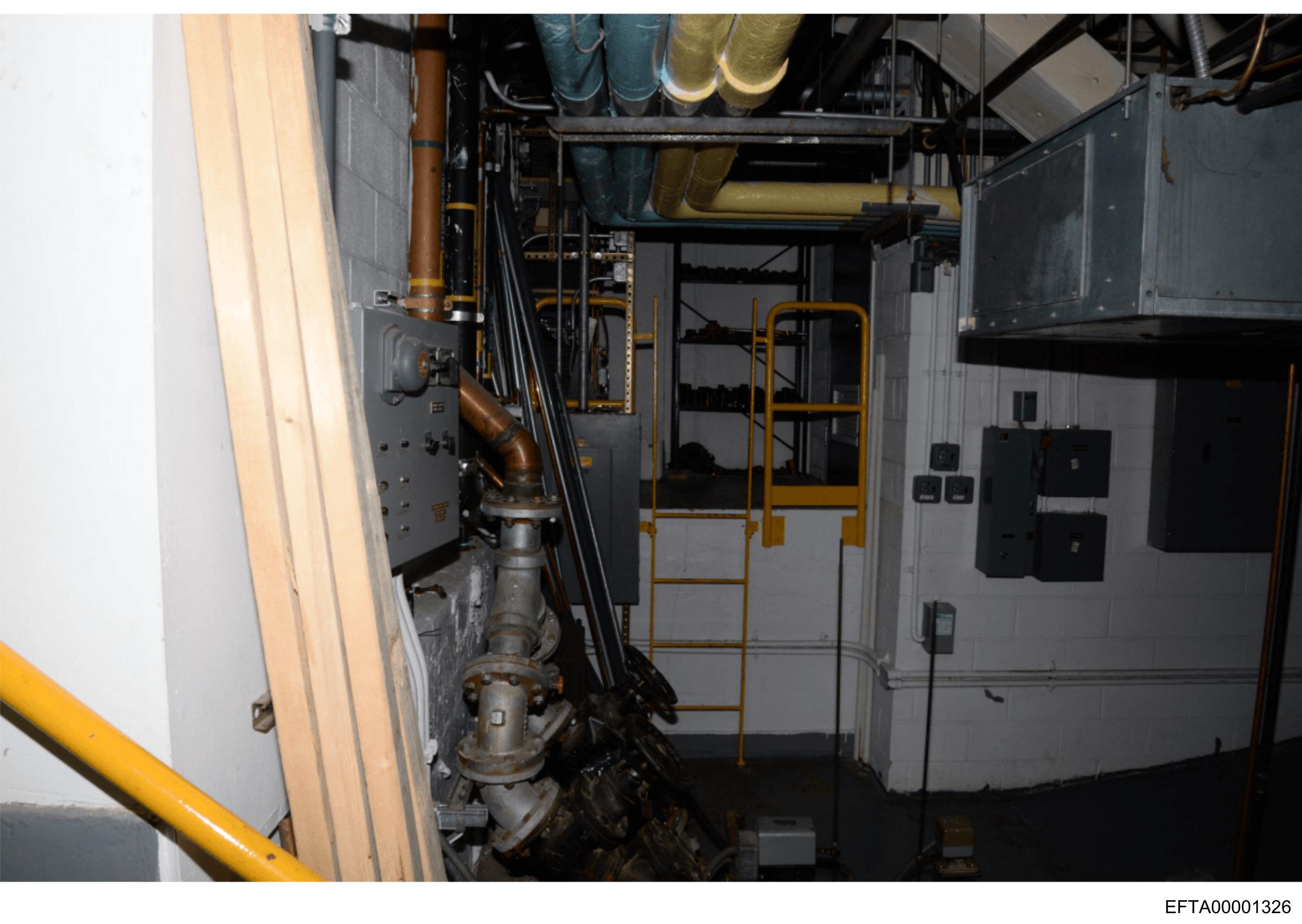 The image shows the interior of a room that appears to be undergoing construction or renovation. There are pipes running along the walls and ceiling, suggesting it might be part of an industrial or mechanical system. A staircase is visible on the right side, leading to another level not fully visible in the frame. The color scheme consists mostly of dark tones with some yellow accents, possibly from paint or protective coatings. The room has exposed metal beams and ductwork, indicating that the space may be part of a larger infrastructure or mechanical system within a building. There is no text visible in the image to provide context or location details. The style of the photograph seems candid and informative rather than artistic, capturing the state of the room as it stands at the time the photo was taken.