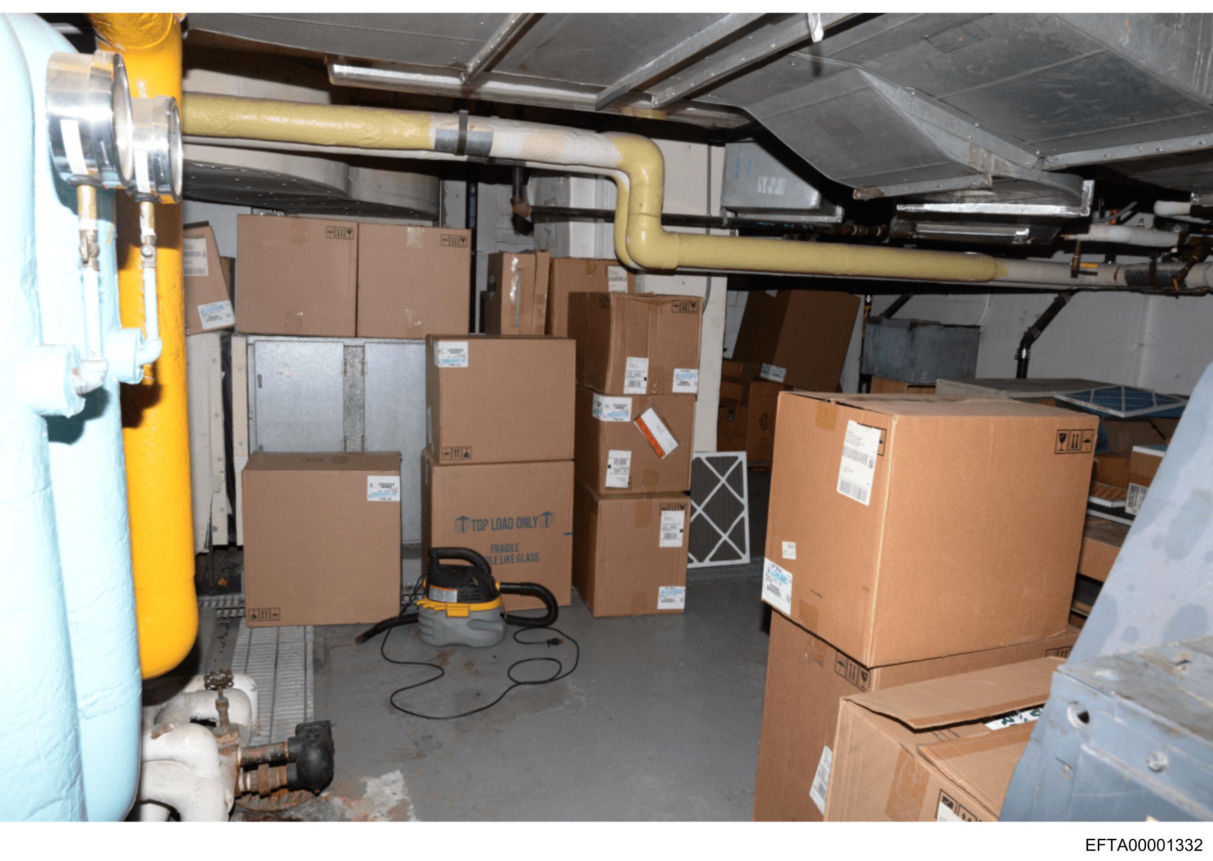 The image depicts a dimly lit room with several stacked cardboard boxes against one wall. The ceiling is low and has exposed pipes running across it. On the floor, there's an industrial-looking machine or piece of equipment with various attachments, suggesting this space may be used for manufacturing or processing materials. There are no people visible in the image. In the corner of the photo, there's a watermark that reads "ETPXC," which is likely an abbreviation associated with the entity that owns the image, possibly related to its copyright or ownership. The overall atmosphere of the room suggests it might be part of a basement or lower level of a building, used for storage or industrial purposes.