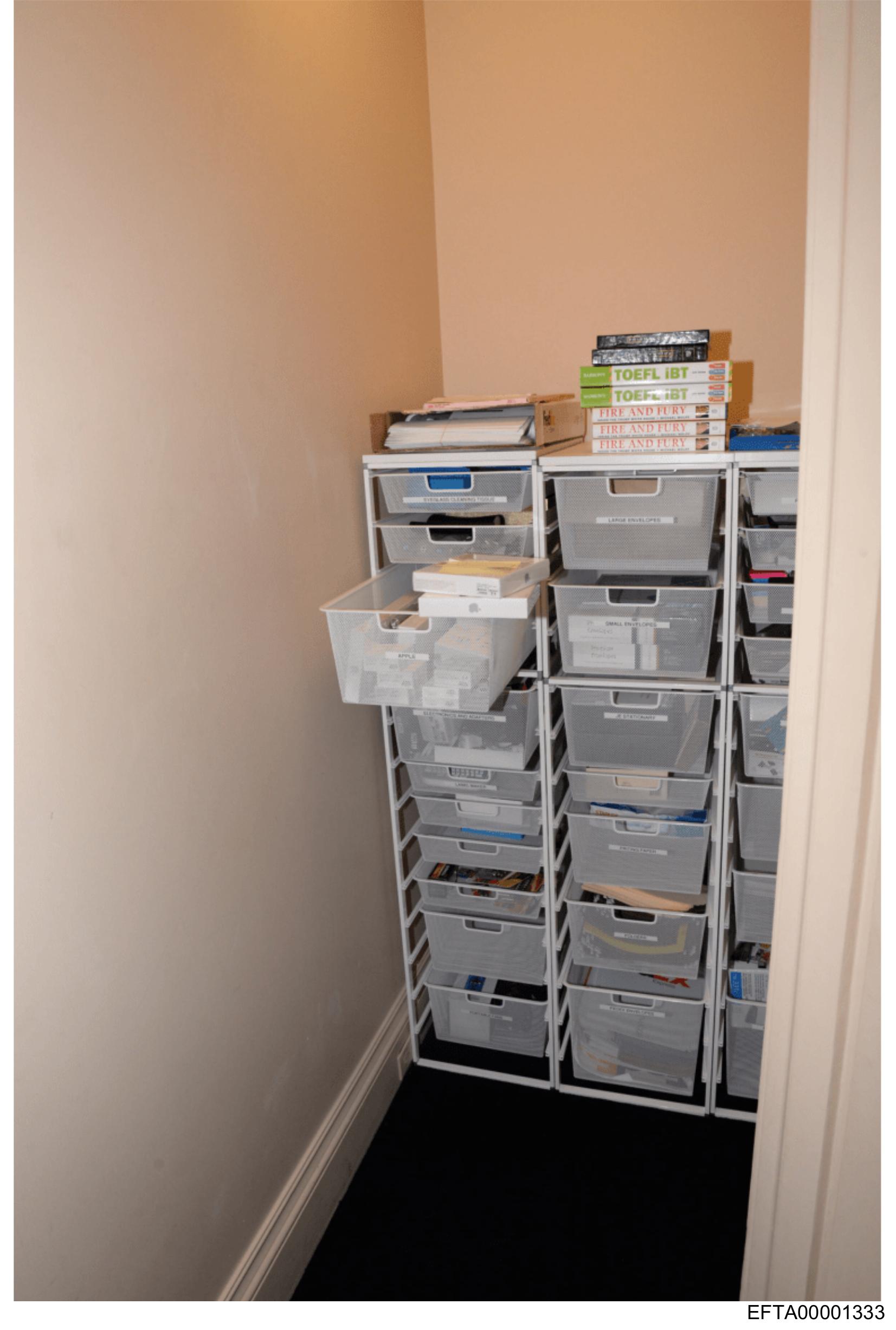 The image shows a corner of an office area with several open file drawers on a wall. There are books and folders inside the drawers, suggesting that the space is used for storage and organization of documents or files. The text "ETC" is visible on one of the drawer's labels, but the context or meaning of this text within the image is unclear without additional information. The style of the image appears to be a straightforward, unembellished photograph with no artistic filters or effects applied.