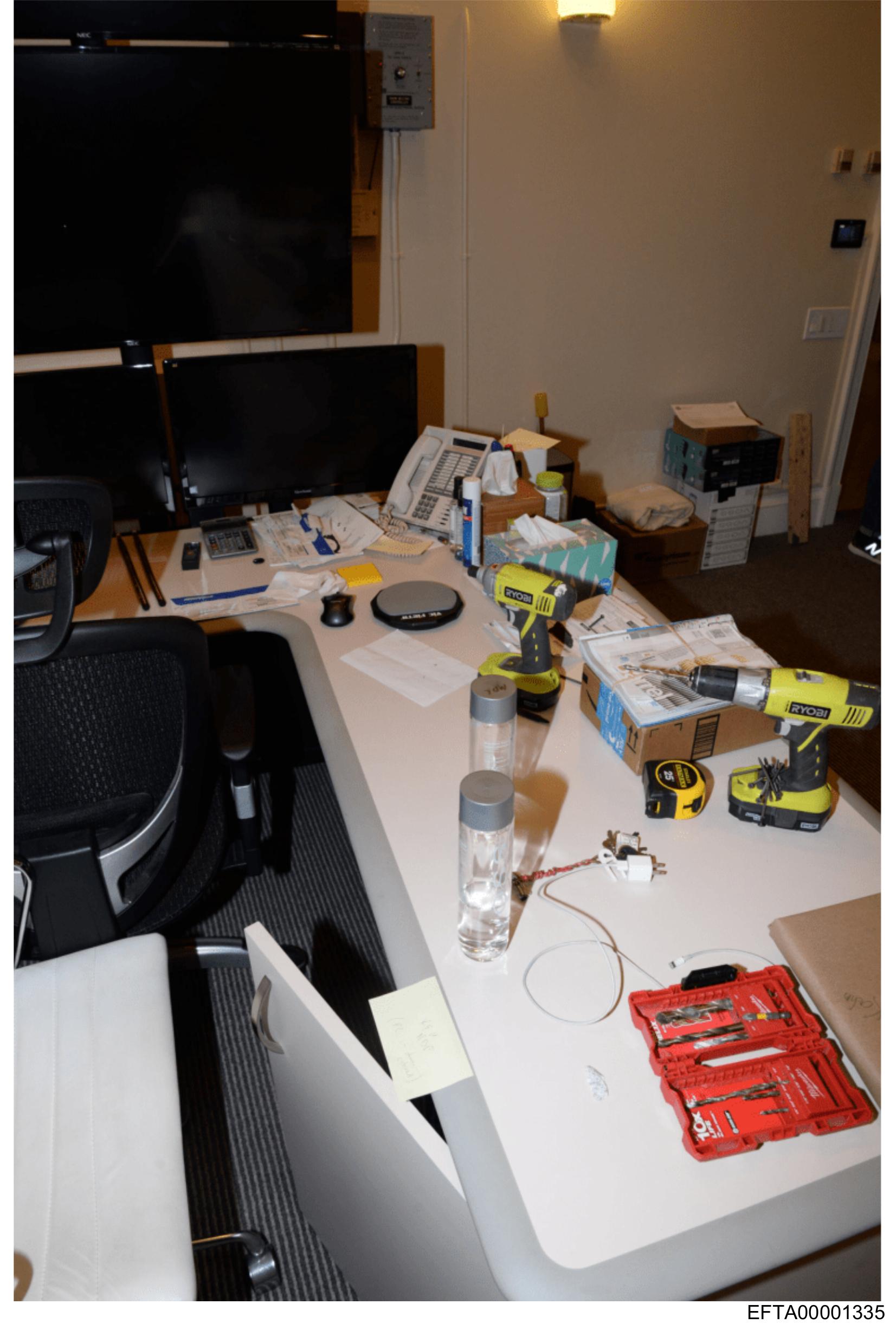 The image shows an indoor setting with a desk that appears to be undergoing some work or repair.