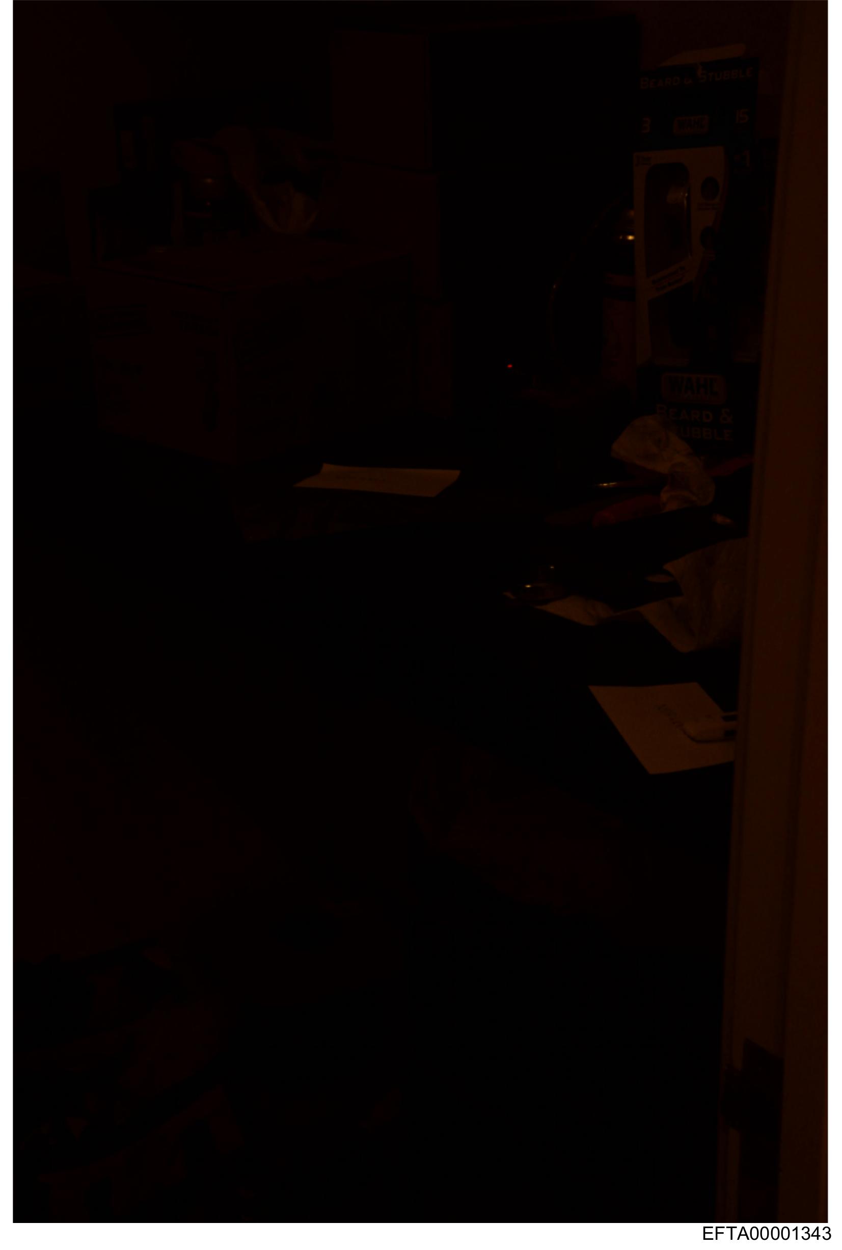 The image appears to be a low-light photograph of a cluttered indoor space, possibly a room with various items scattered around.