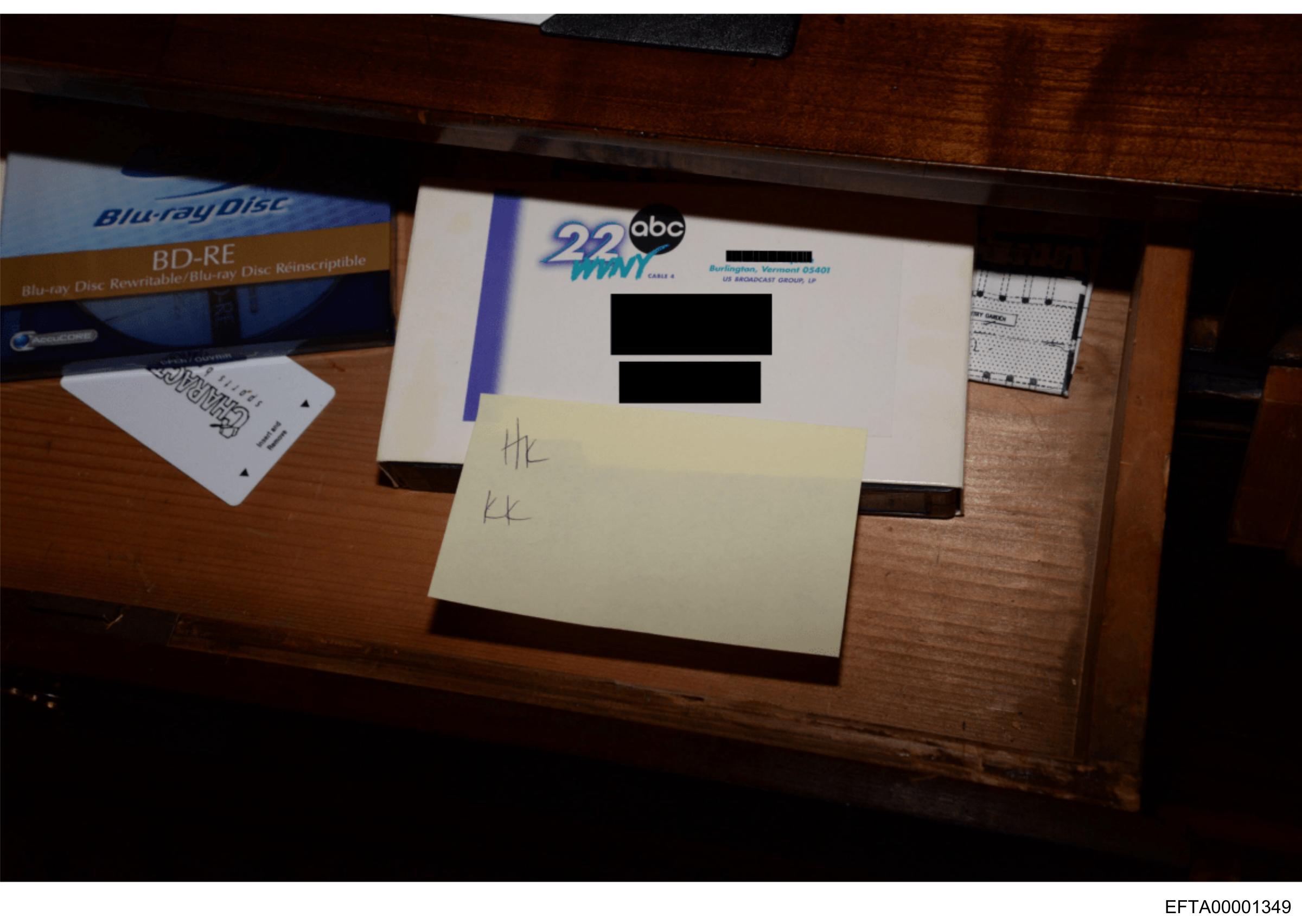 The image shows an opened drawer with various items inside. At the forefront, there's a box labeled "Rite Aid" partially obscured by a piece of paper that appears to be yellow and has some writing on it, although not all the text is legible due to the angle and focus of the photo. The focus seems slightly soft, which blurs certain parts of the image, making it difficult to read small details like numbers or specific product names. The drawer's interior suggests an office or personal workspace environment. There are no visible people in this image.