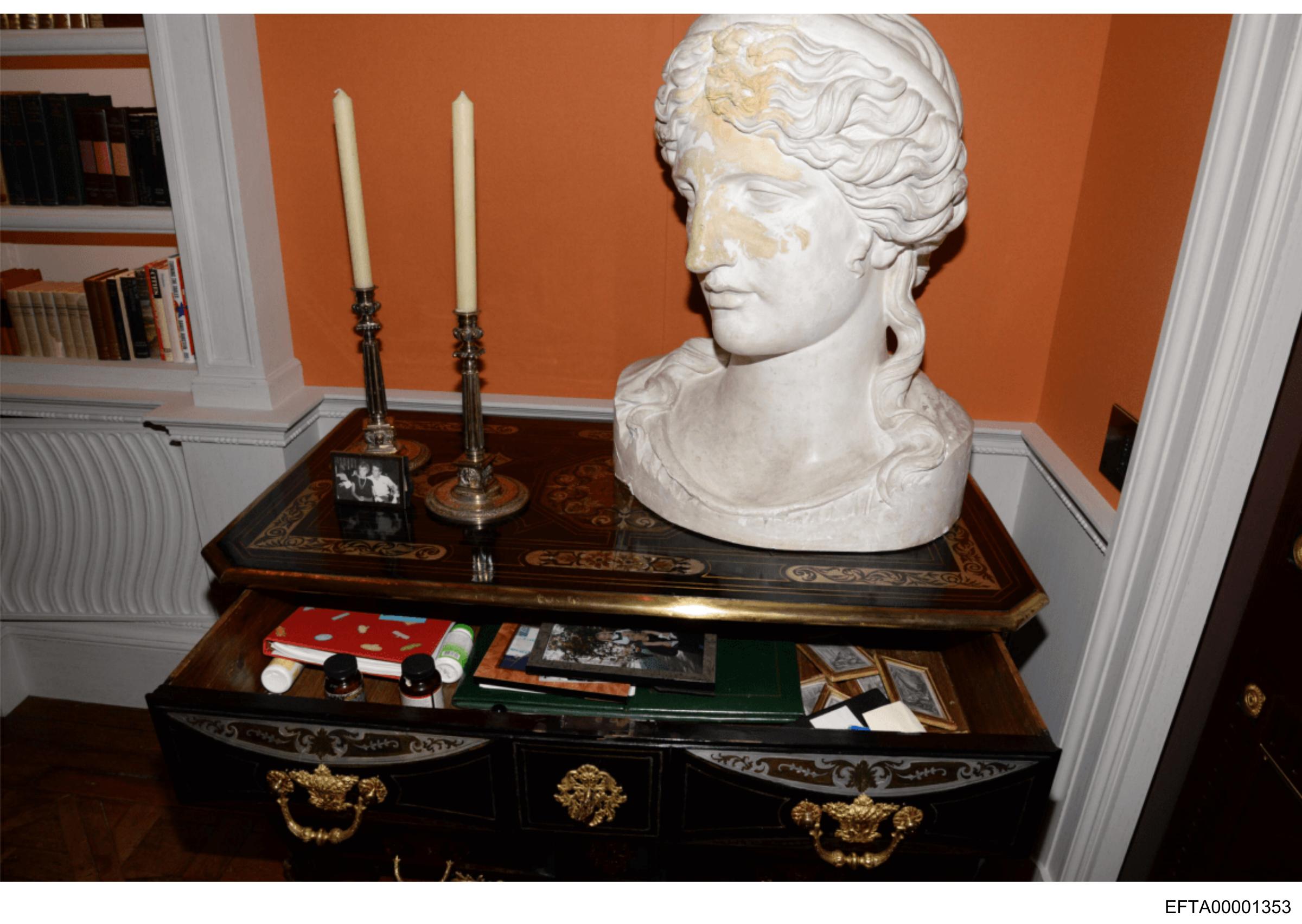 The image shows an indoor setting with a focus on a white marble bust of what appears to be a classical figure, possibly from ancient Roman or Greek mythology, seated atop a wooden chest or trunk.