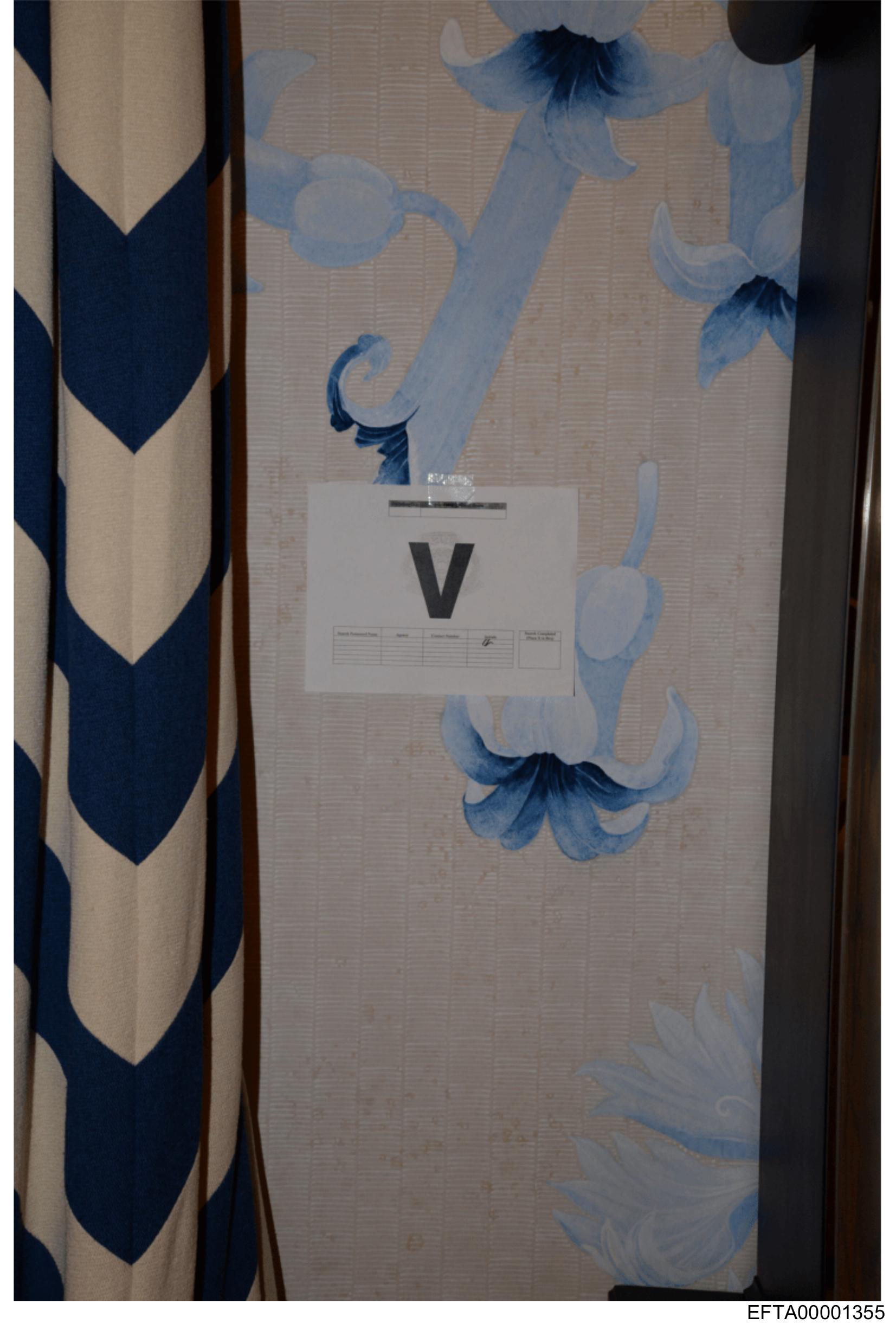 The image depicts a close-up of a wall with floral wallpaper. There is a piece of paper affixed to the wall; however, it's partially obscured and not fully legible due to its size and position in the frame. The text visible on the paper includes a "V" followed by another letter or number, but the rest of the content is cut off. A person can be seen in the reflection of a mirror that hangs above the piece of paper; however, only a portion of their head and shoulder is visible. The lighting suggests an indoor setting with ambient light sources.