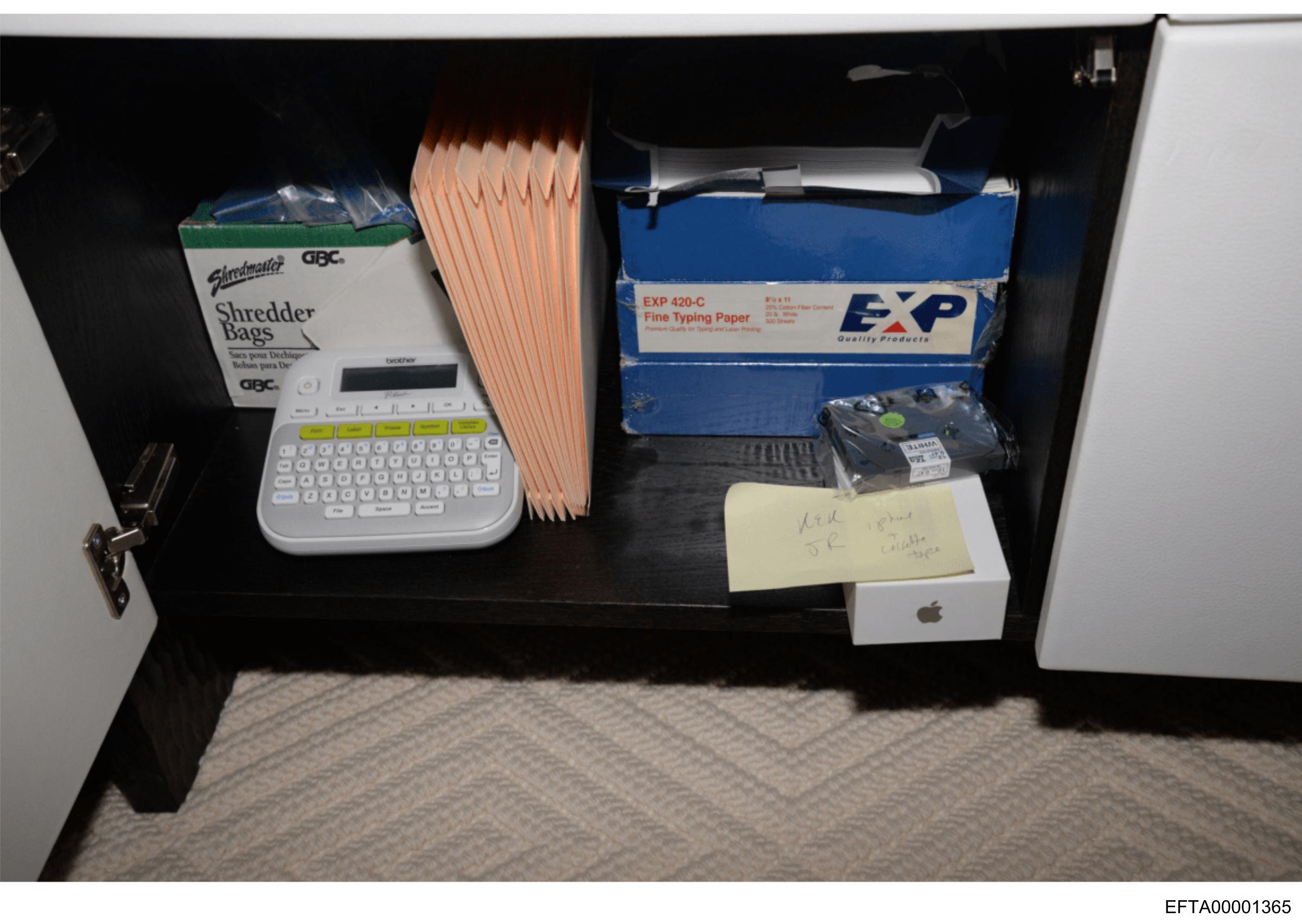 The image displays an open drawer with various items inside. There is a row of small boxes that appear to be tissue packs on the top left side. In front of these boxes, there's a white label printer with visible buttons and a display screen. Adjacent to this, partially obscured by the drawer's opening mechanism, there seems to be a blue-labeled item that could be a CD spindle or another type of storage container. Below the printer and boxes is a flat surface where additional items are placed; however, these are not fully visible due to the angle and depth perspective in the image. The text on the label printer screen is too small to read clearly. There are no people or recognizable locations present in this image.