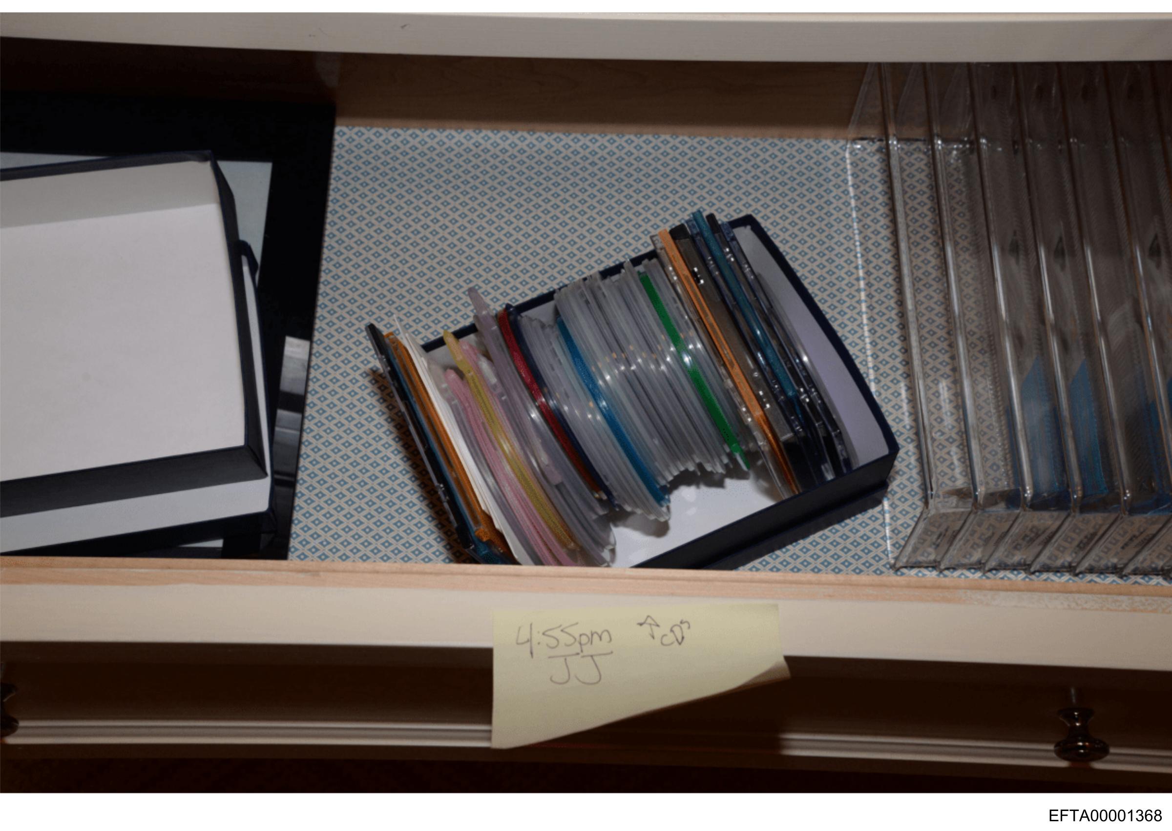The image shows an open drawer filled with a collection of CDs.